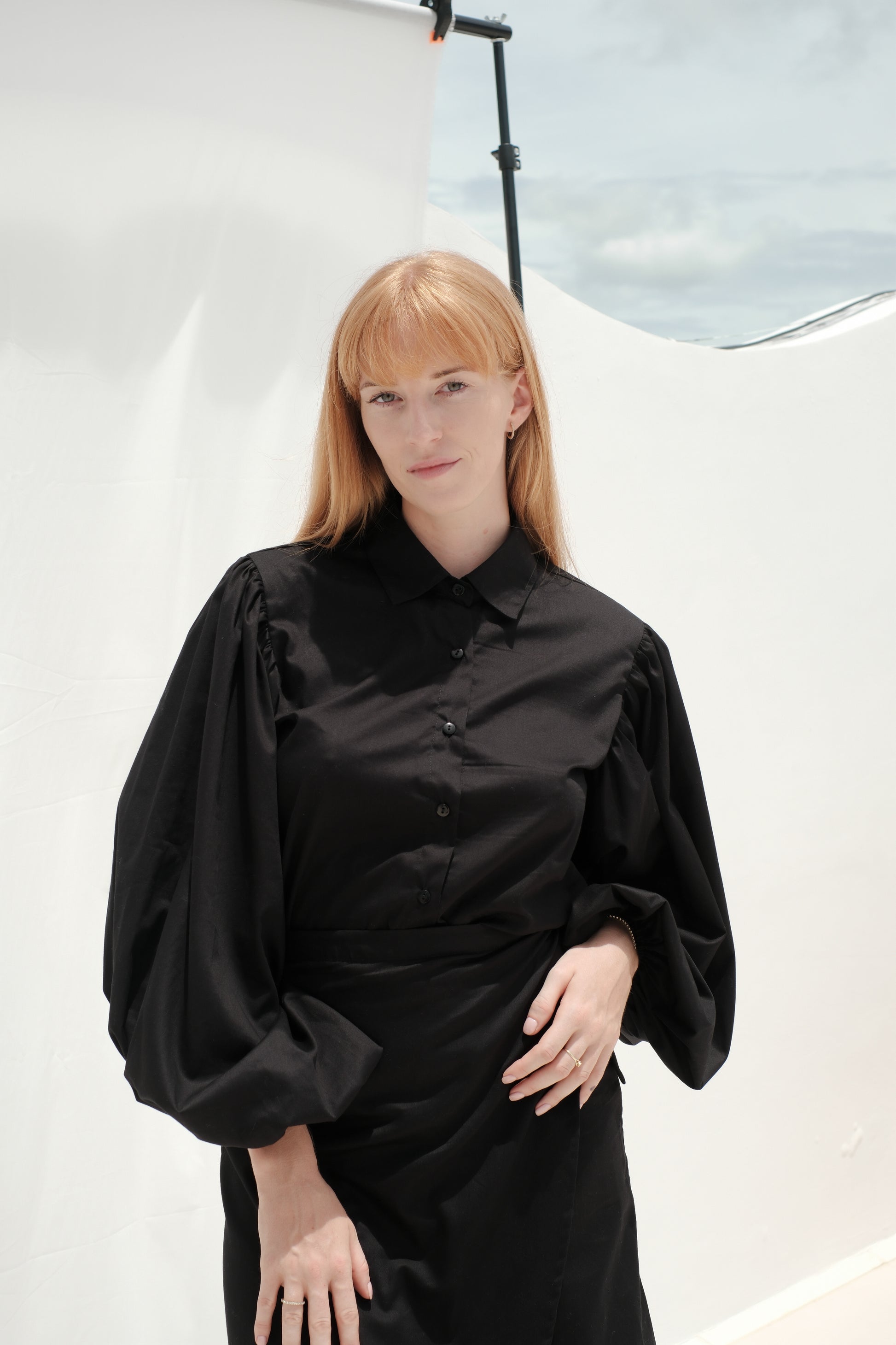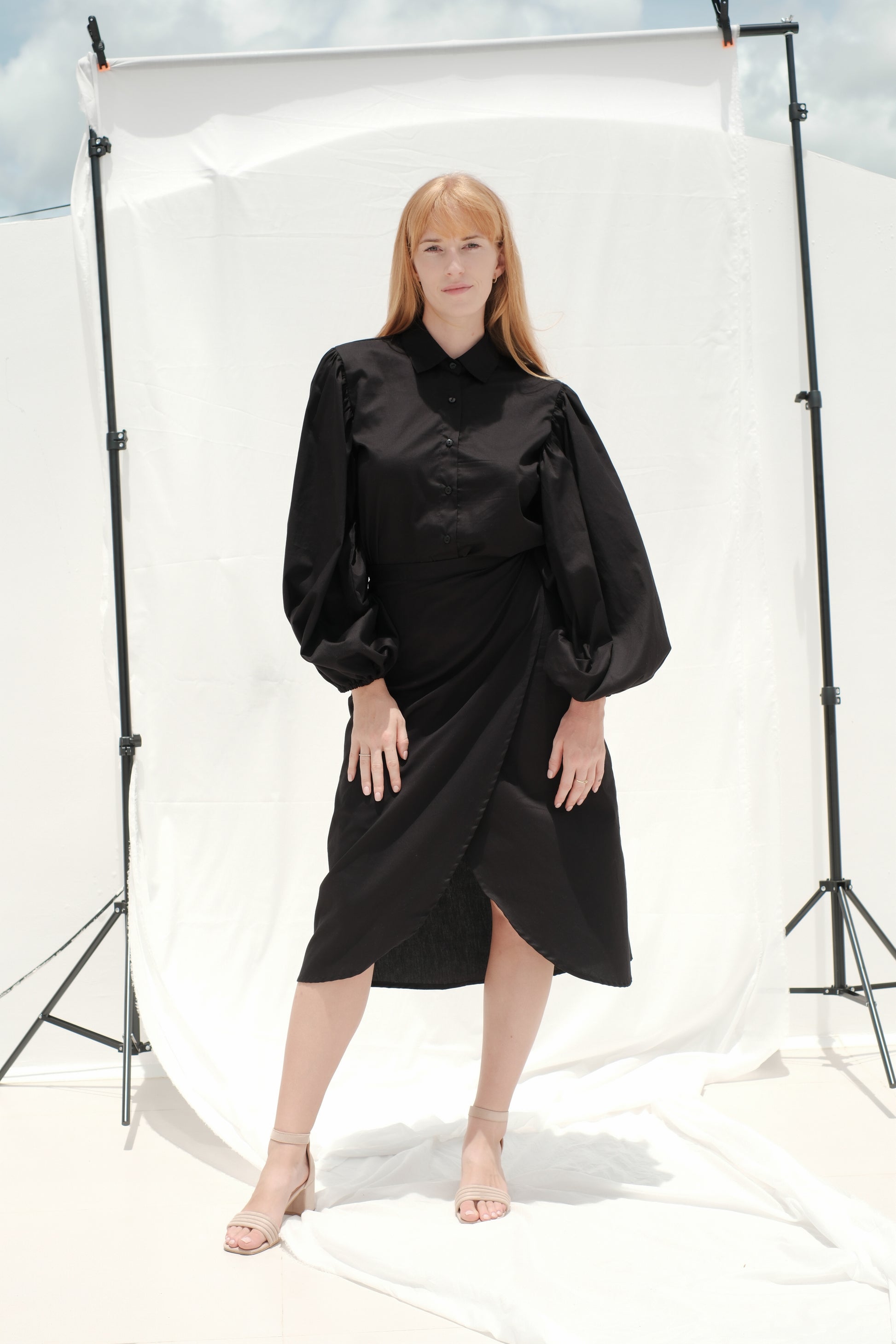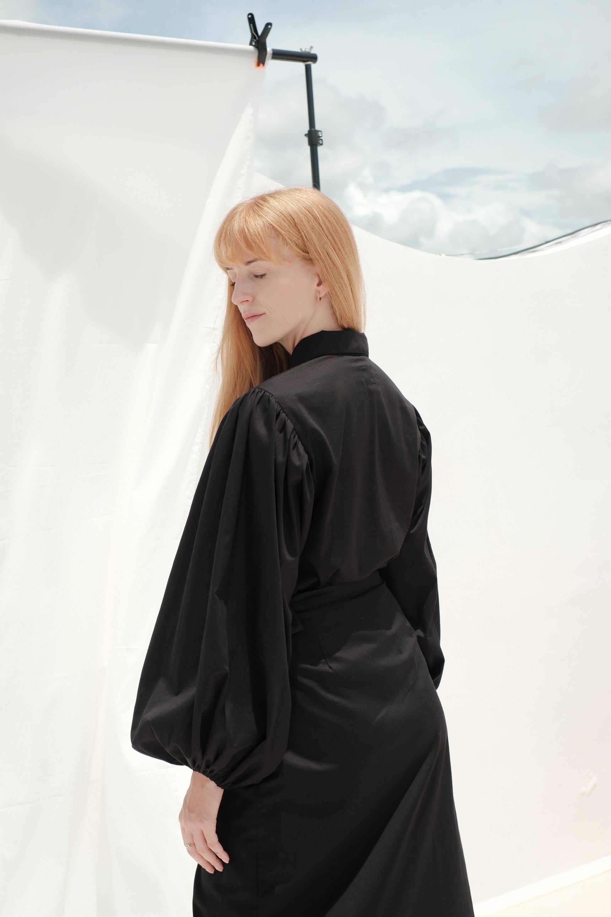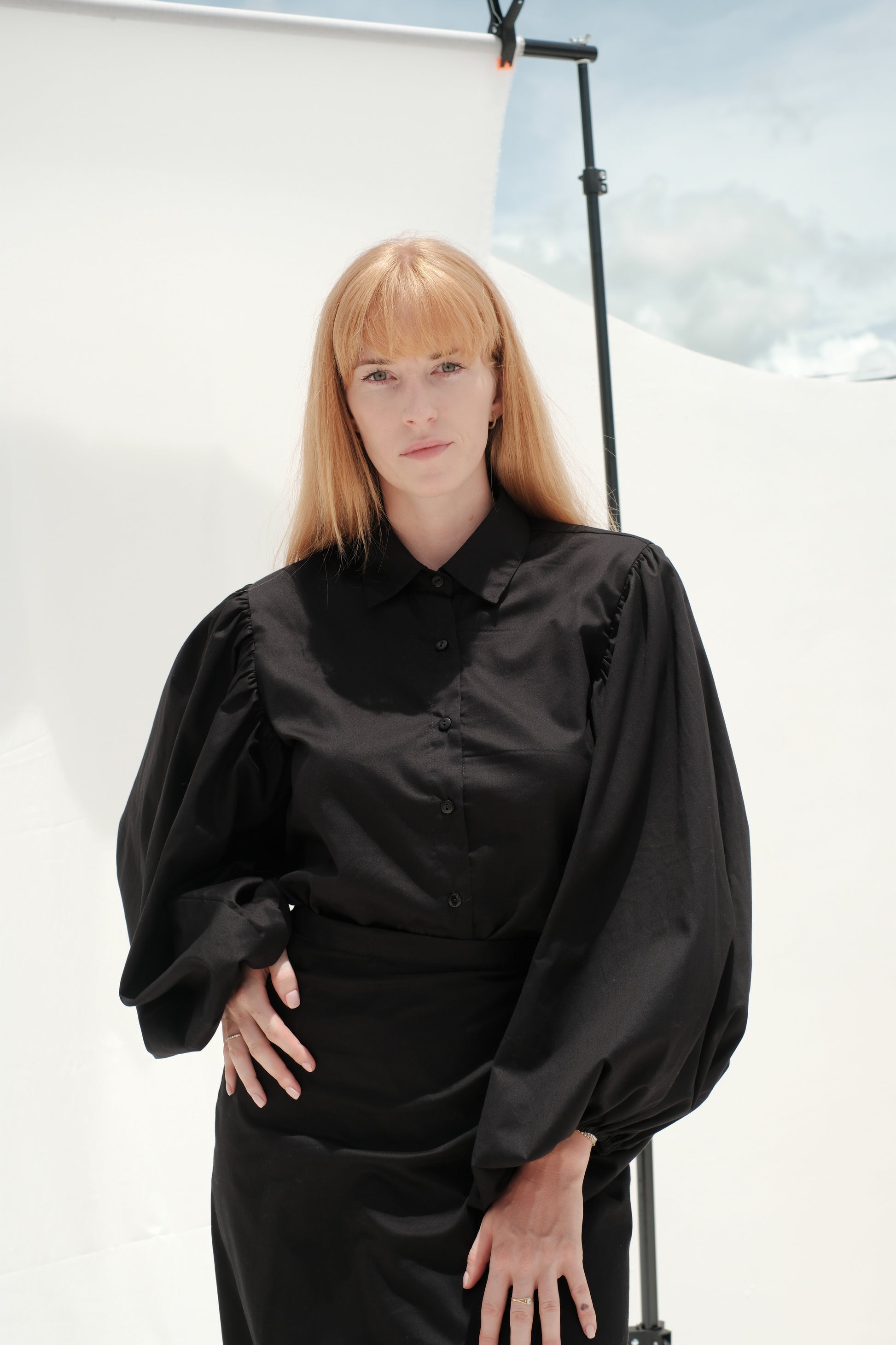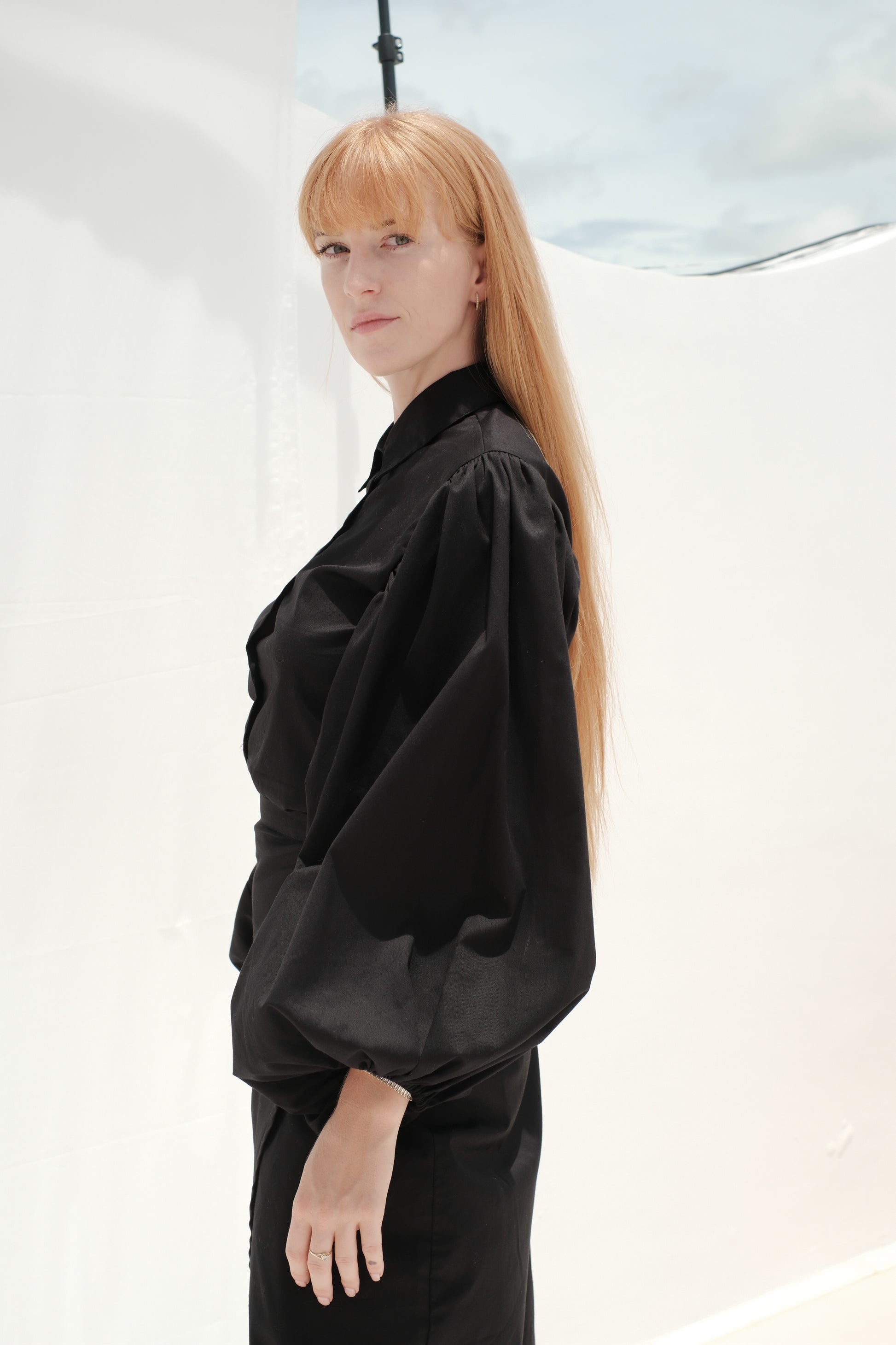 Tato černá bavlněná košile je ušitá z kvalitní, pevnější 100% bavlny, která drží tvar a zároveň je příjemná na nošení. Má výrazné řasené rukávy, které dodávají celé siluetě elegantní a moderní vzhled.