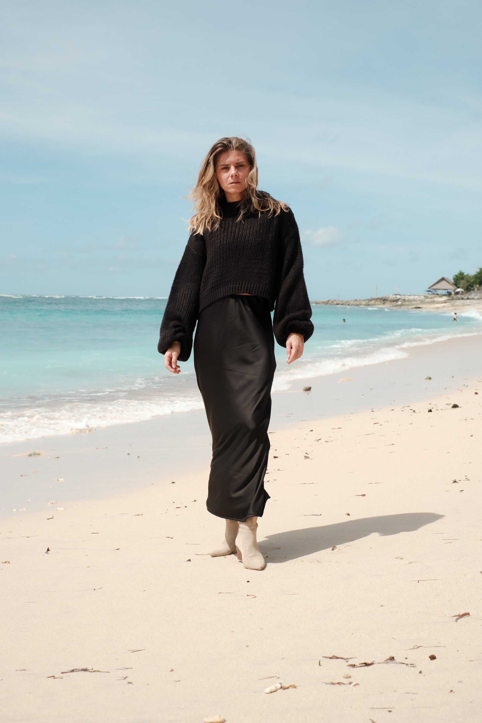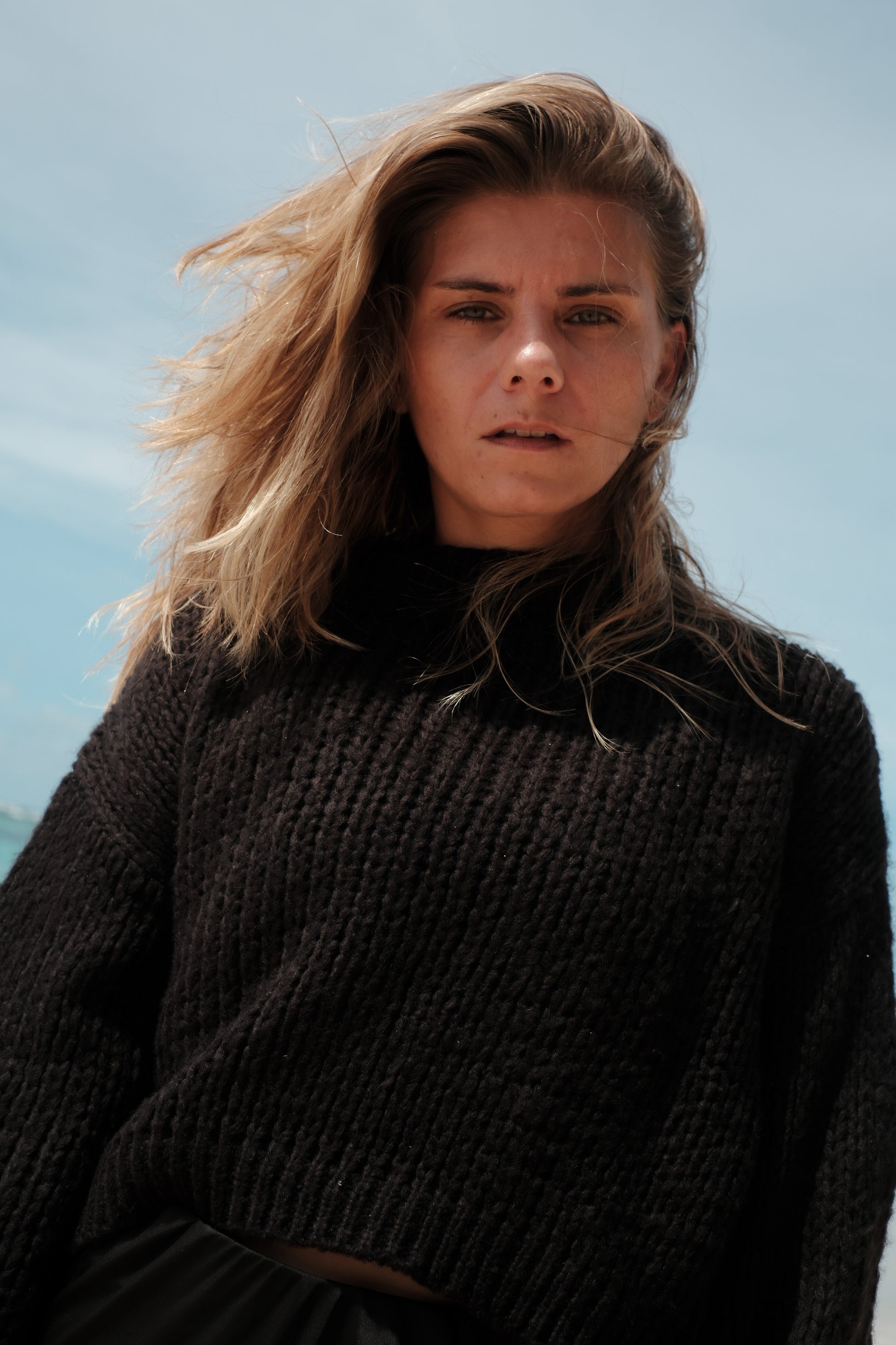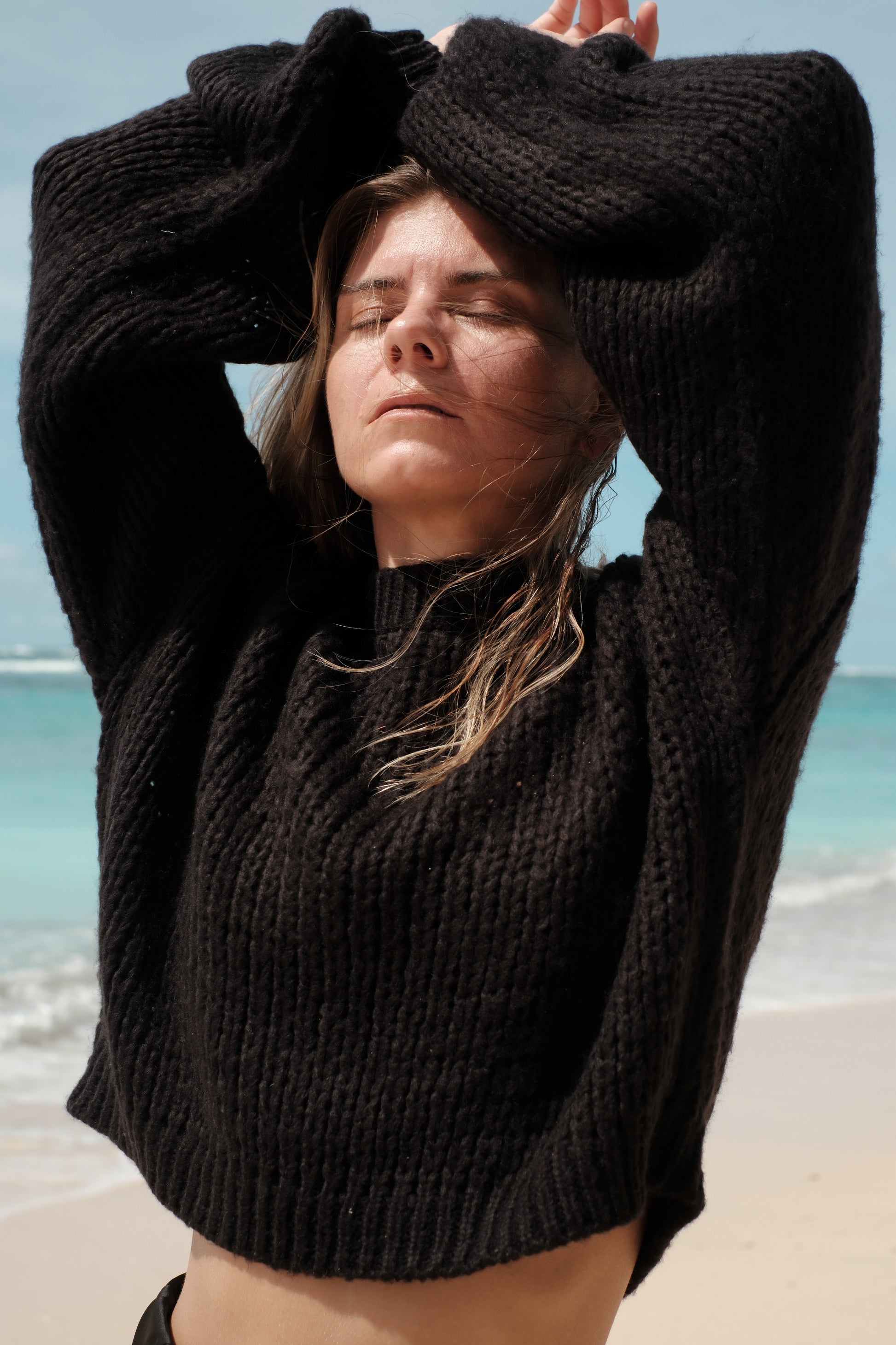 Tento černý crop svetr je strojově pletený zkušenými řemeslníky z prémiové směsi 30 % mohéru a 70 % vlny. Materiál je mimořádně měkoučký, hebký na dotek a vůbec nekouše. Má lehký, nadýchaný úplet a rukávy v jemně balonovém střihu, které dodávají celému kousku ženský a moderní vzhled.
