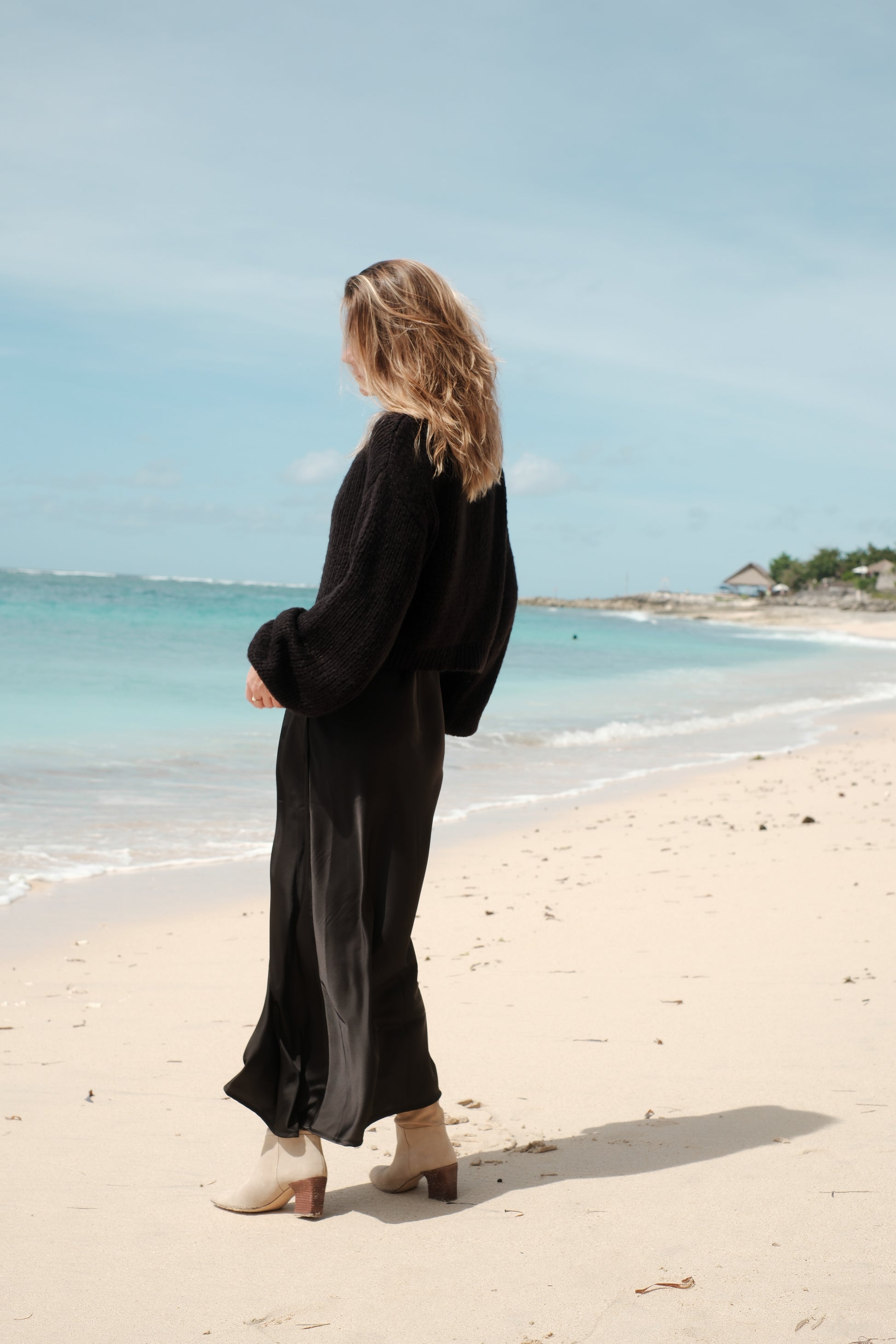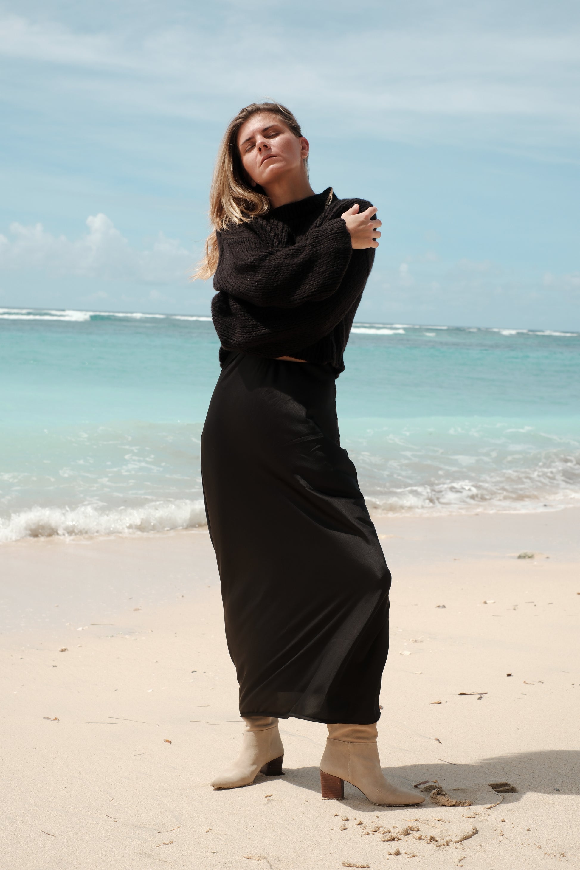 Dostupný je v jedné oversize velikosti, která pohodlně sedí od S až po L. Díky zkrácenému střihu krásně zvýrazní pas a skvěle ladí k hedvábné sukni z nabídky FLAM. Pro dokonale sladěný set jej můžete doplnit i čepicí ze stejné příze.