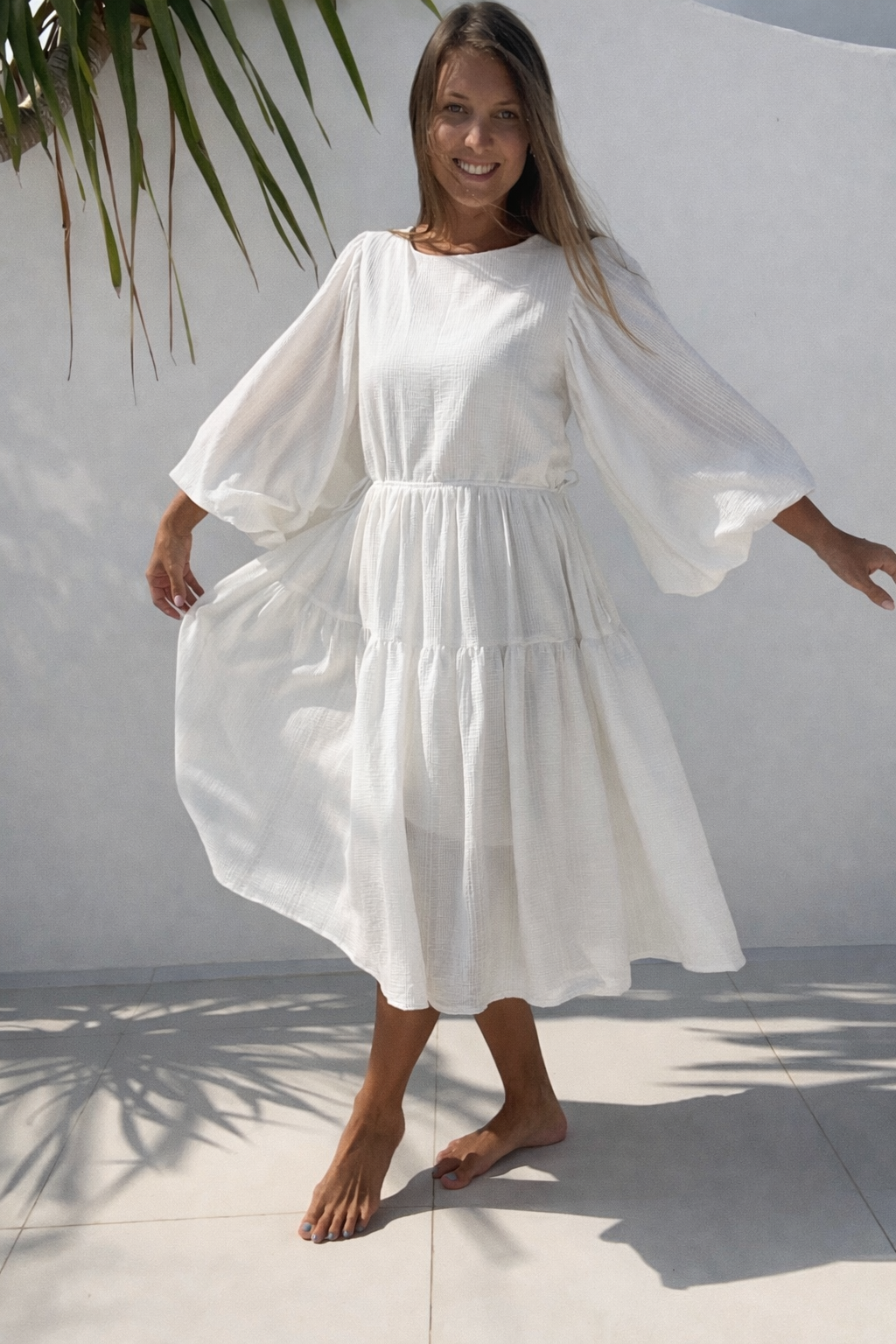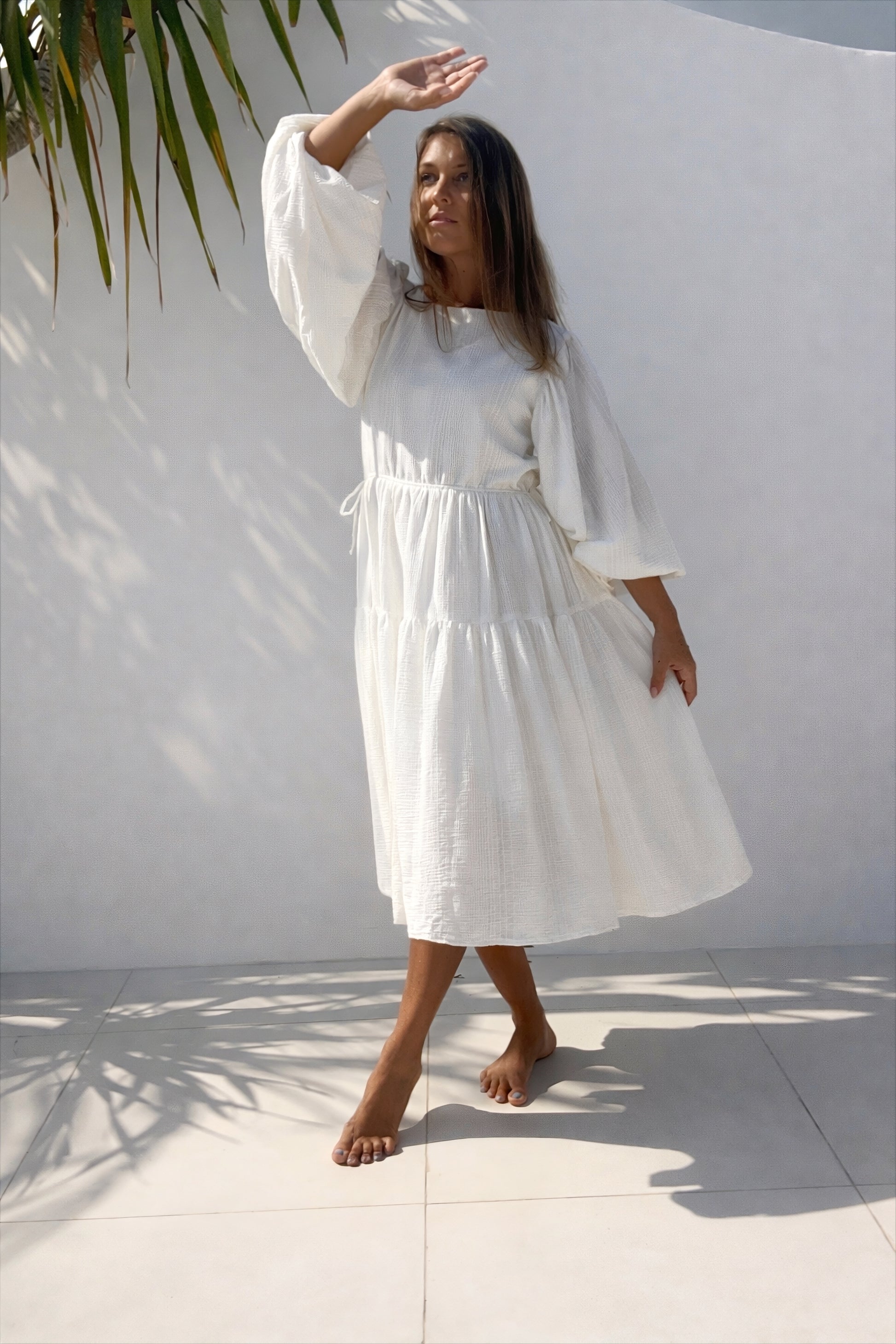 Volnější střih doplňuje stahování v pase na šňůrky, takže si siluetu můžete upravit přesně podle sebe. Nabírané rukávy a vrstvená sukně vytváří ženský, vzdušný pohyb při každém kroku.