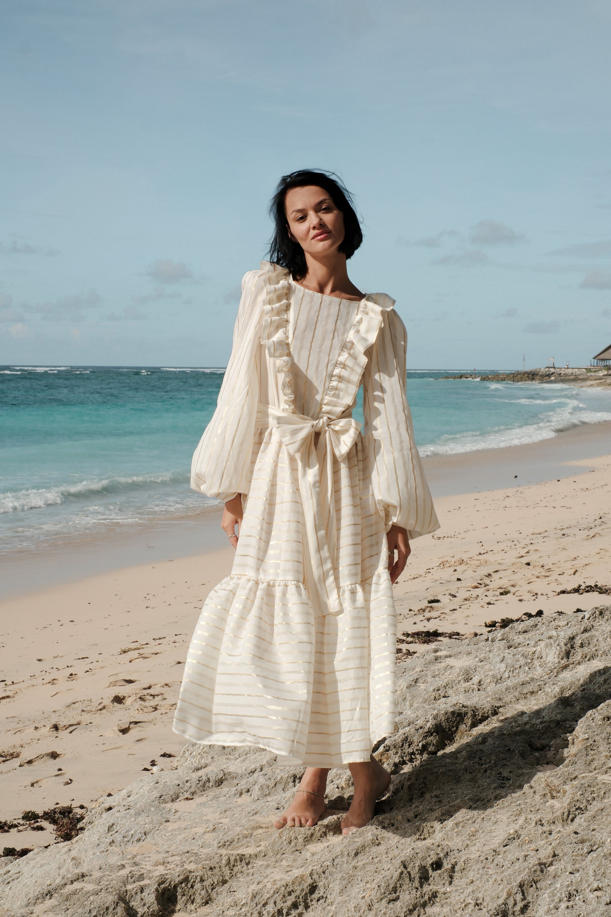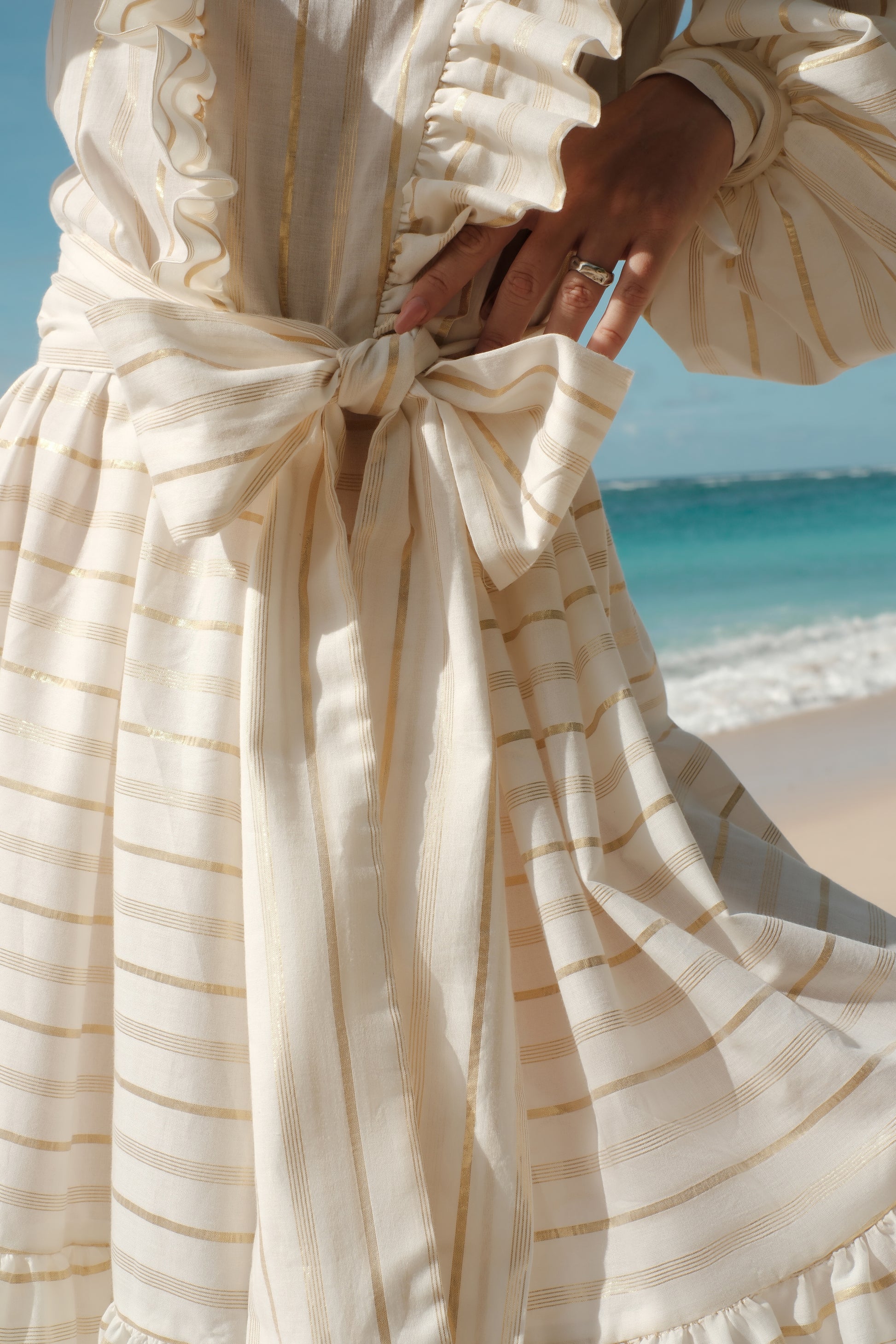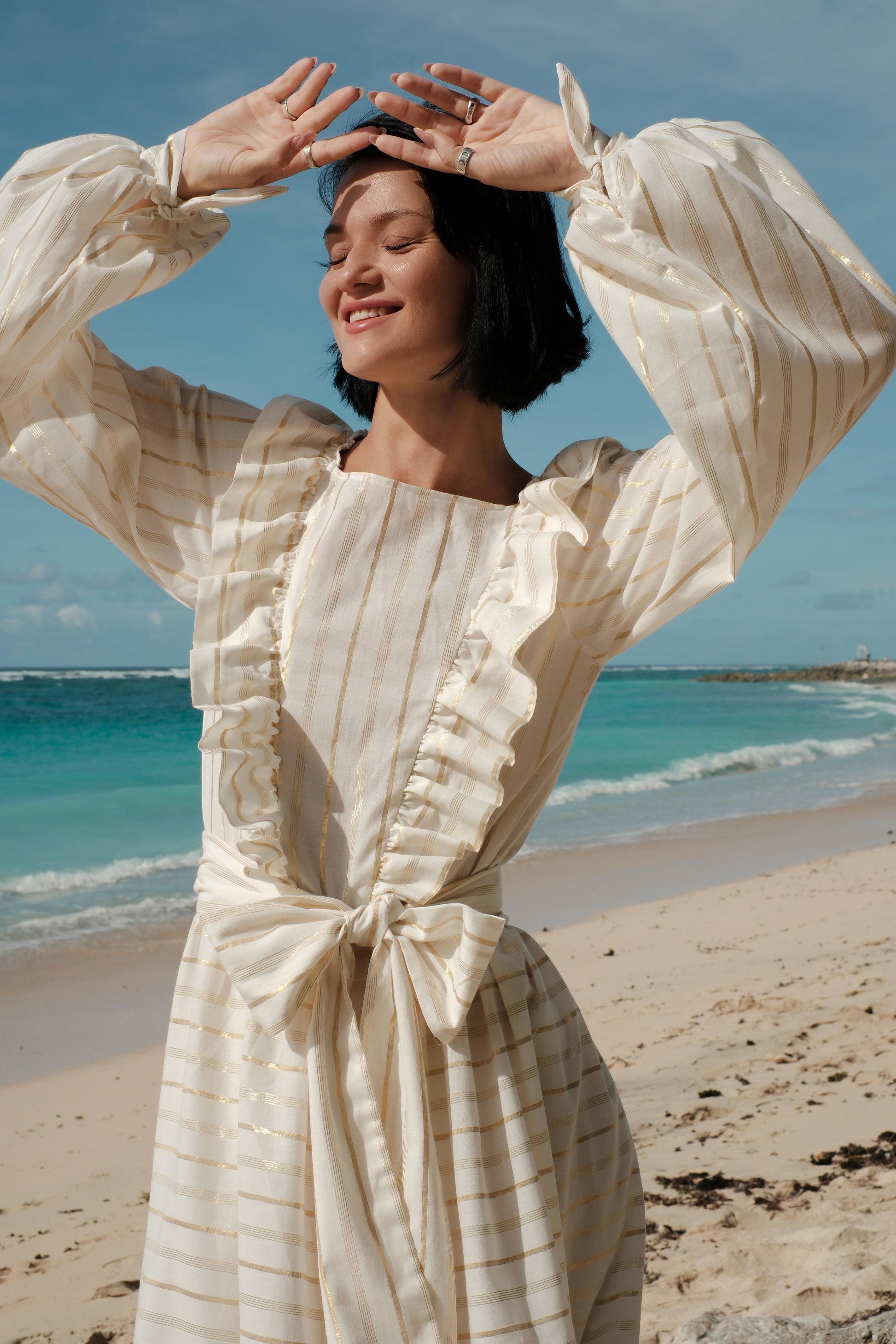 Tyto bílo-zlaté midi šaty jsou ušité z prémiové bavlny se subtilními zlatými pruhy, které jim dodávají jemný, sváteční lesk. Mají výrazné balonové rukávy, širší siluetu a volánkové detaily na přední i zadní části, díky kterým působí velmi ženským a romantickým dojmem.