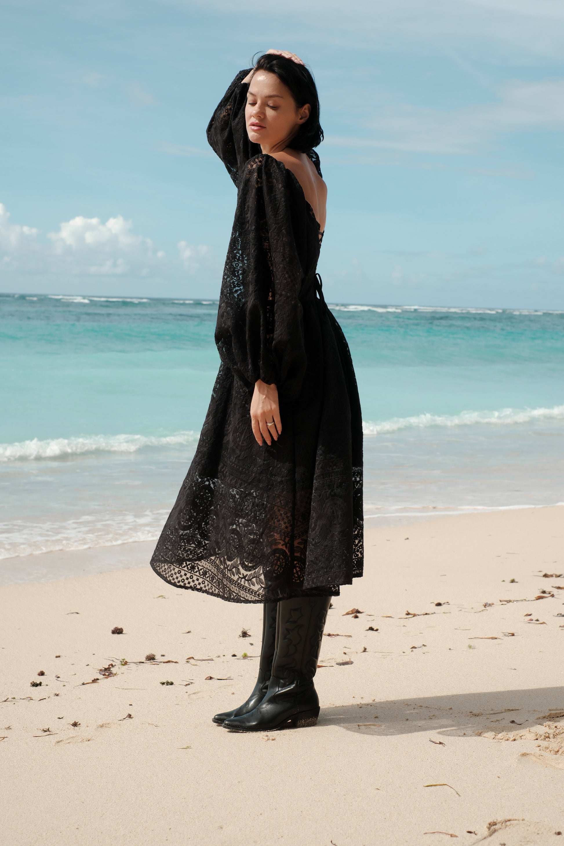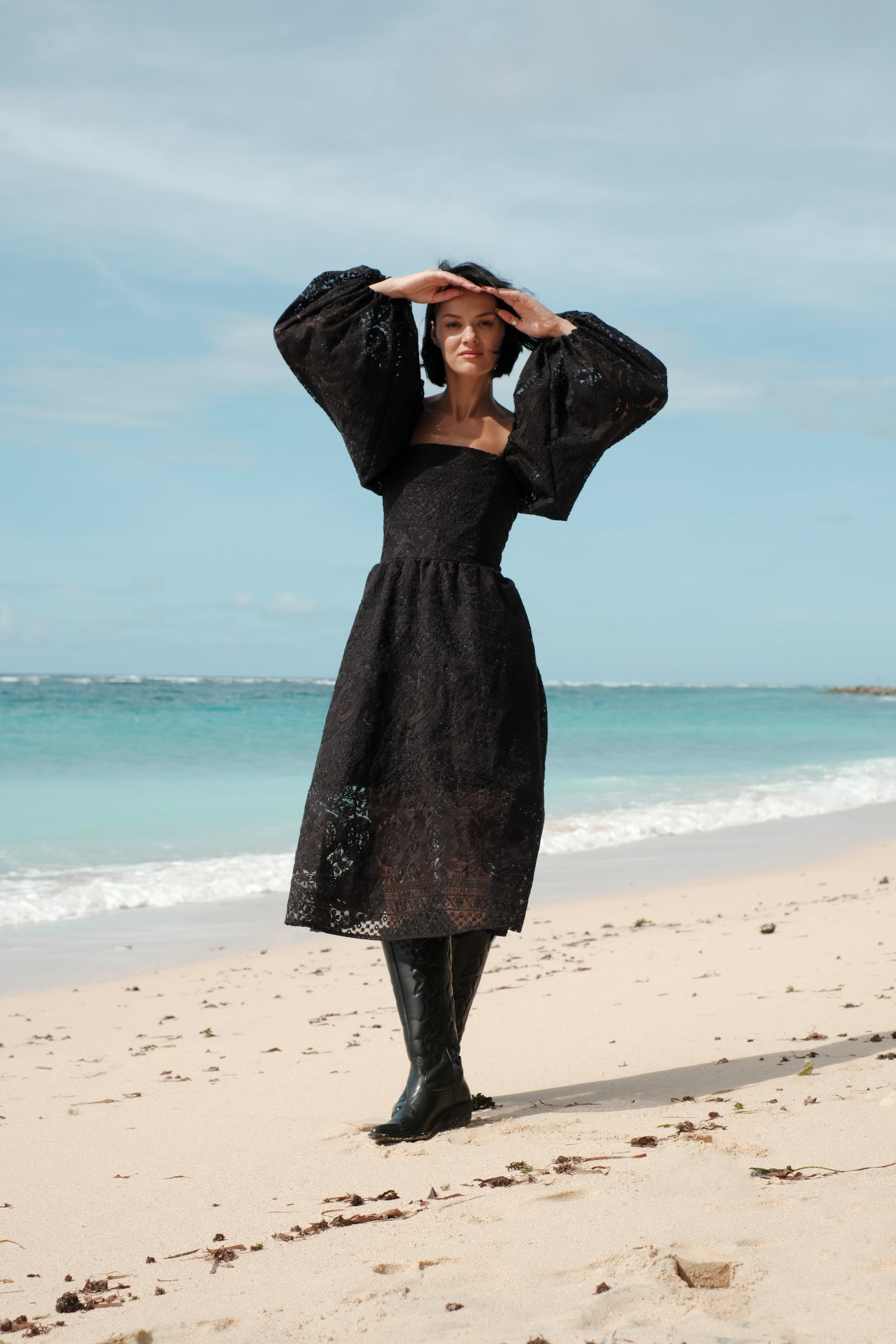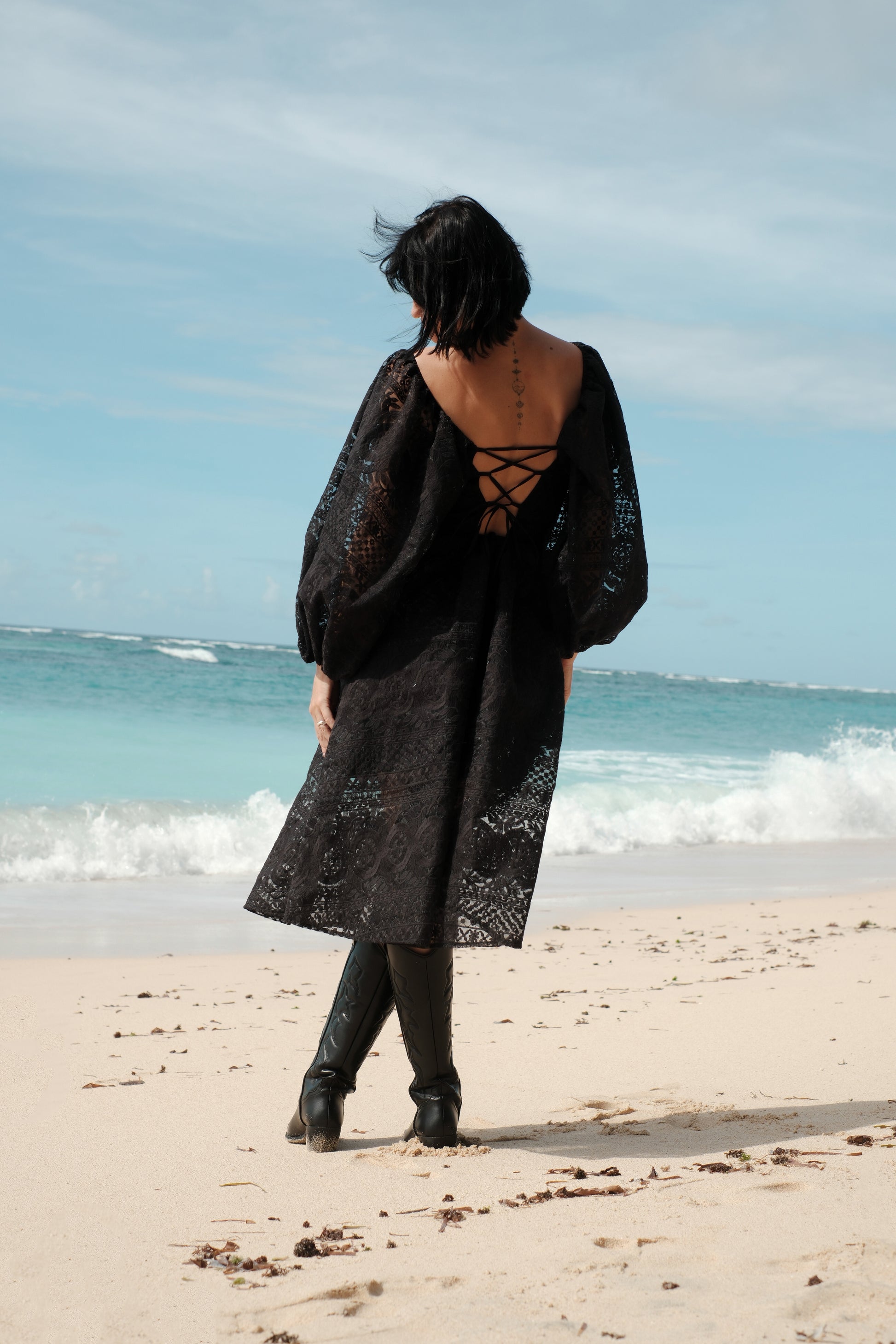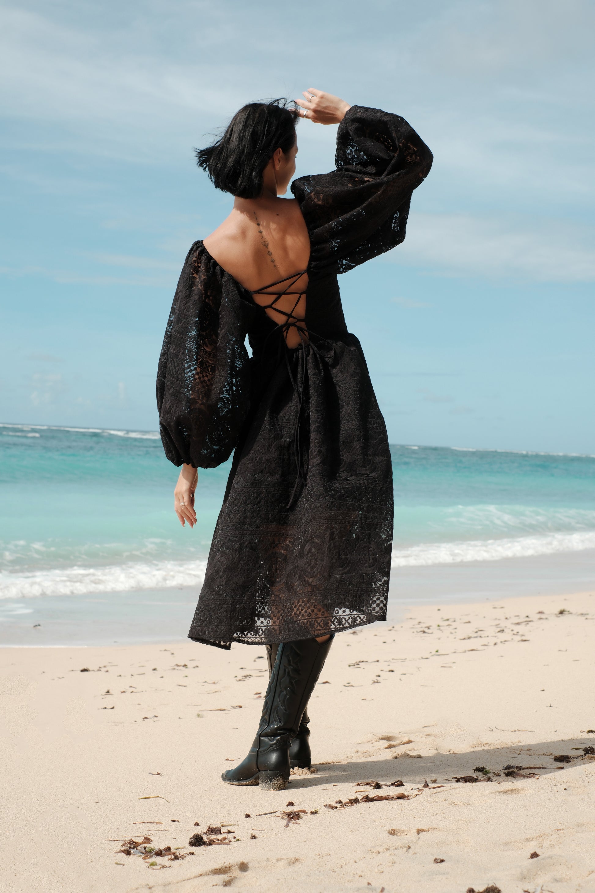 Šaty mají balonové rukávy, které tvoří dramatickou siluetu, a propracovaný živůtek s vázáním na zádech, díky kterému si upravíte šíři i pohodlí podle sebe. Spodní část je lehká, vrstvená a mírně průsvitná – ideální s černým spodním prádlem nebo podšívkou podle potřeby.