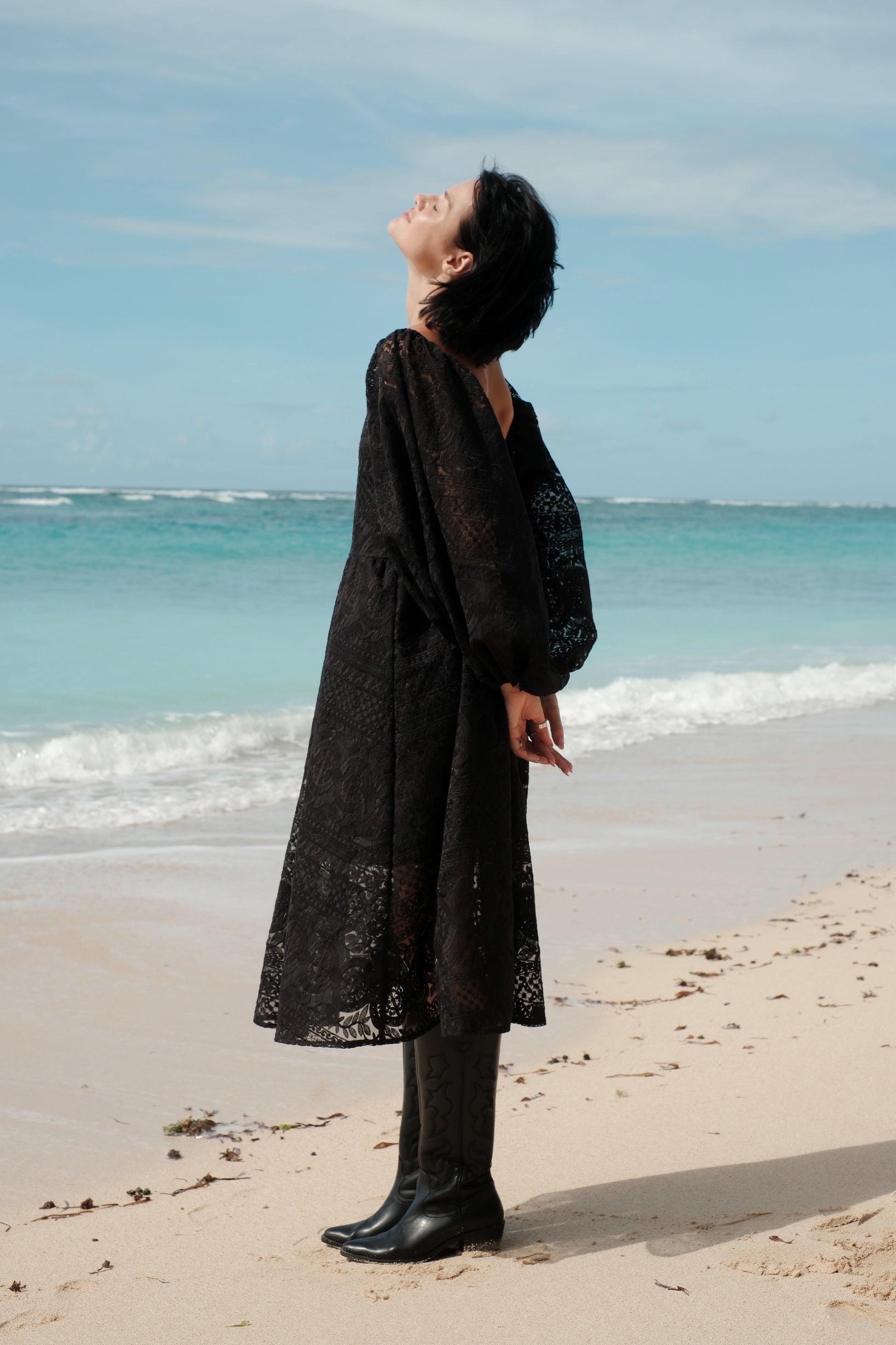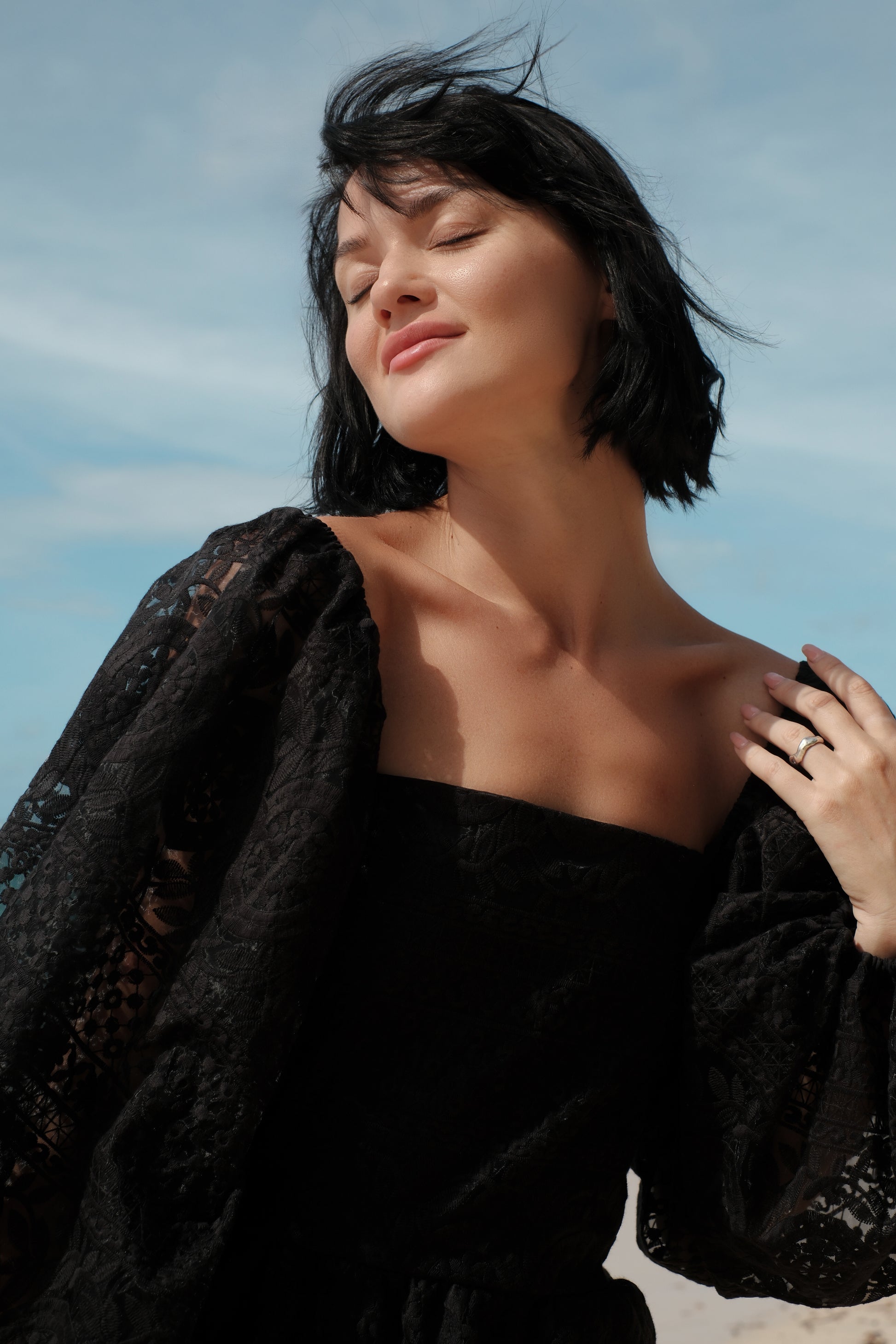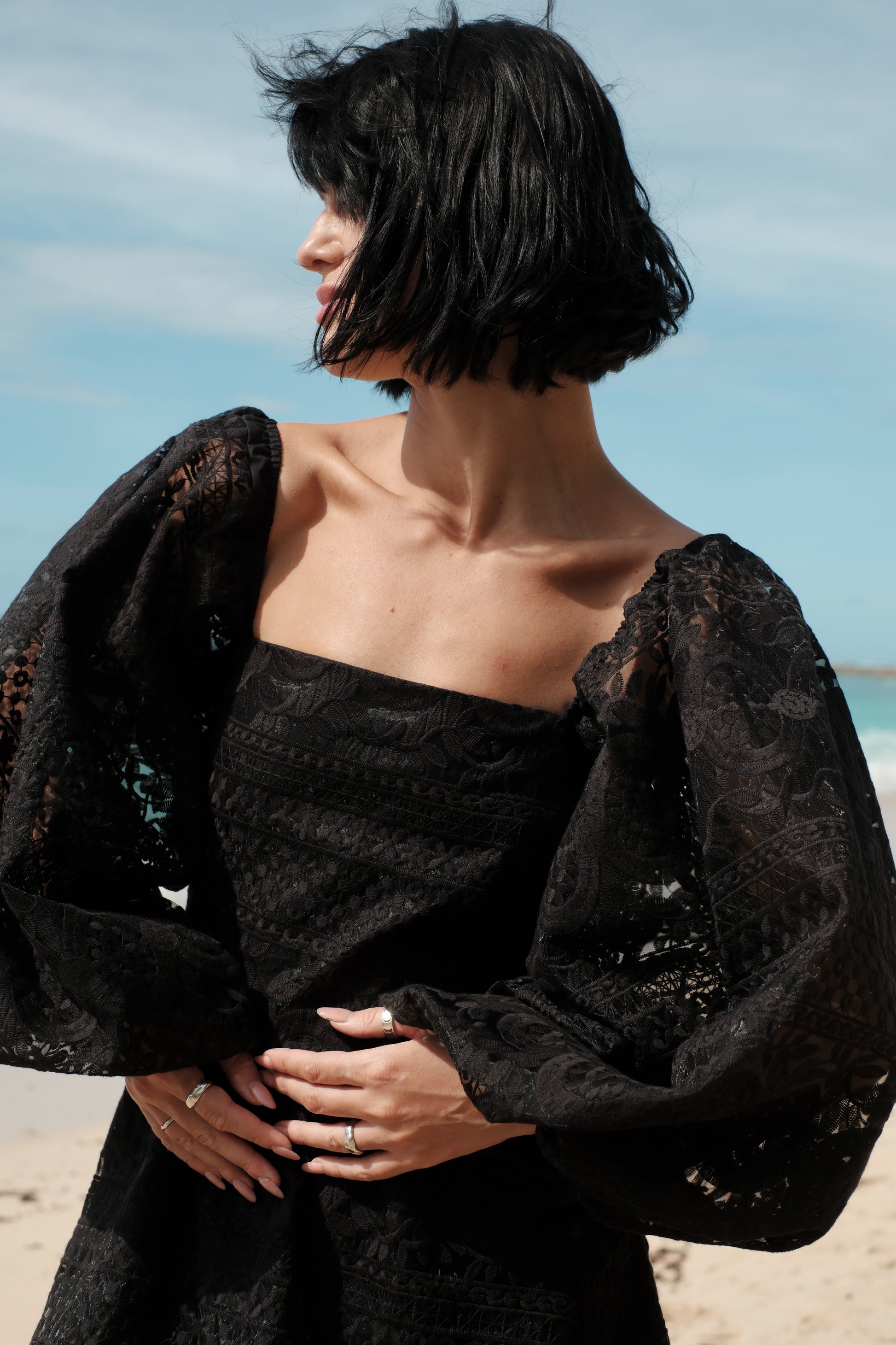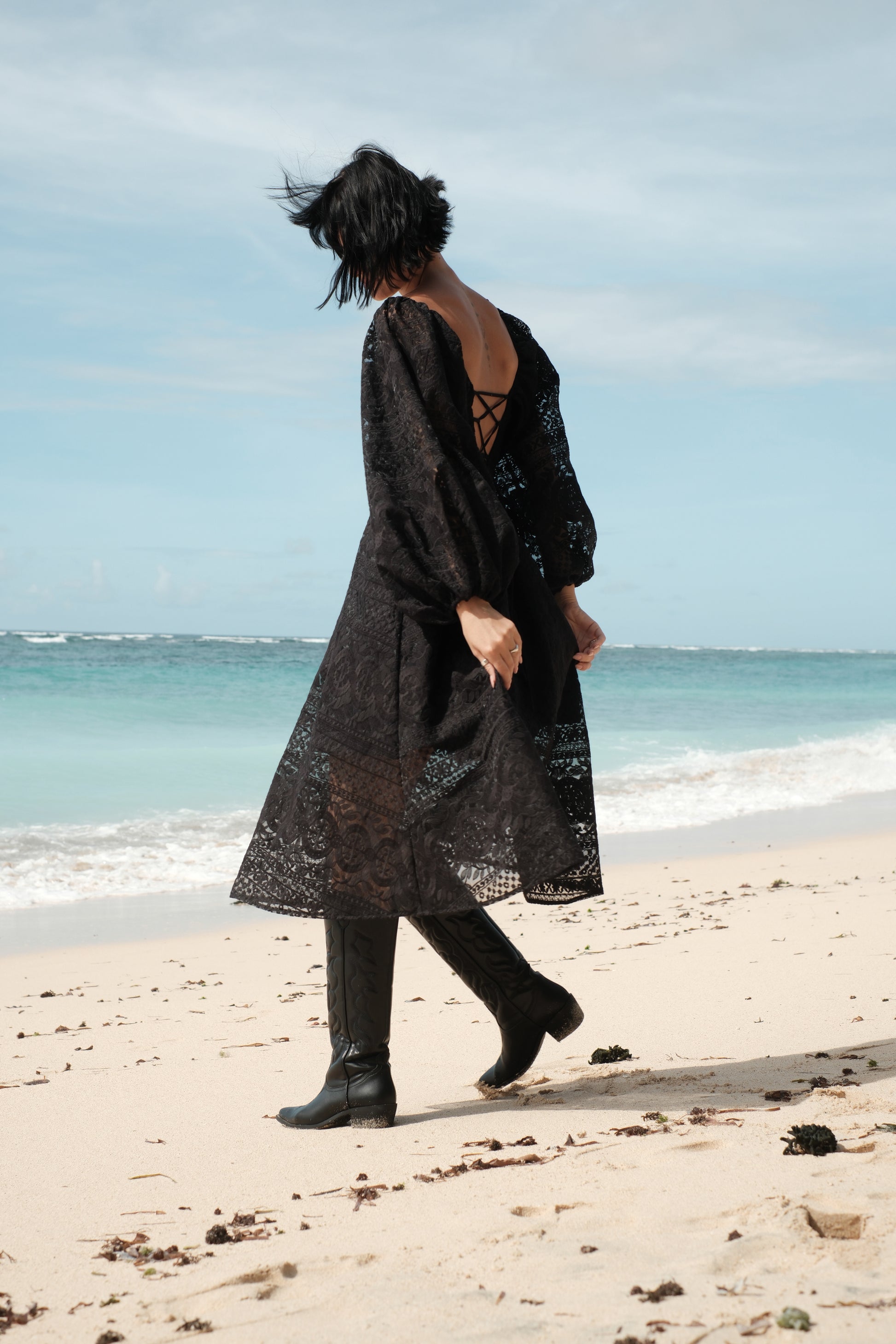 Šaty mají balonové rukávy, které tvoří dramatickou siluetu, a propracovaný živůtek s vázáním na zádech, díky kterému si upravíte šíři i pohodlí podle sebe. Spodní část je lehká, vrstvená a mírně průsvitná – ideální s černým spodním prádlem nebo podšívkou podle potřeby.