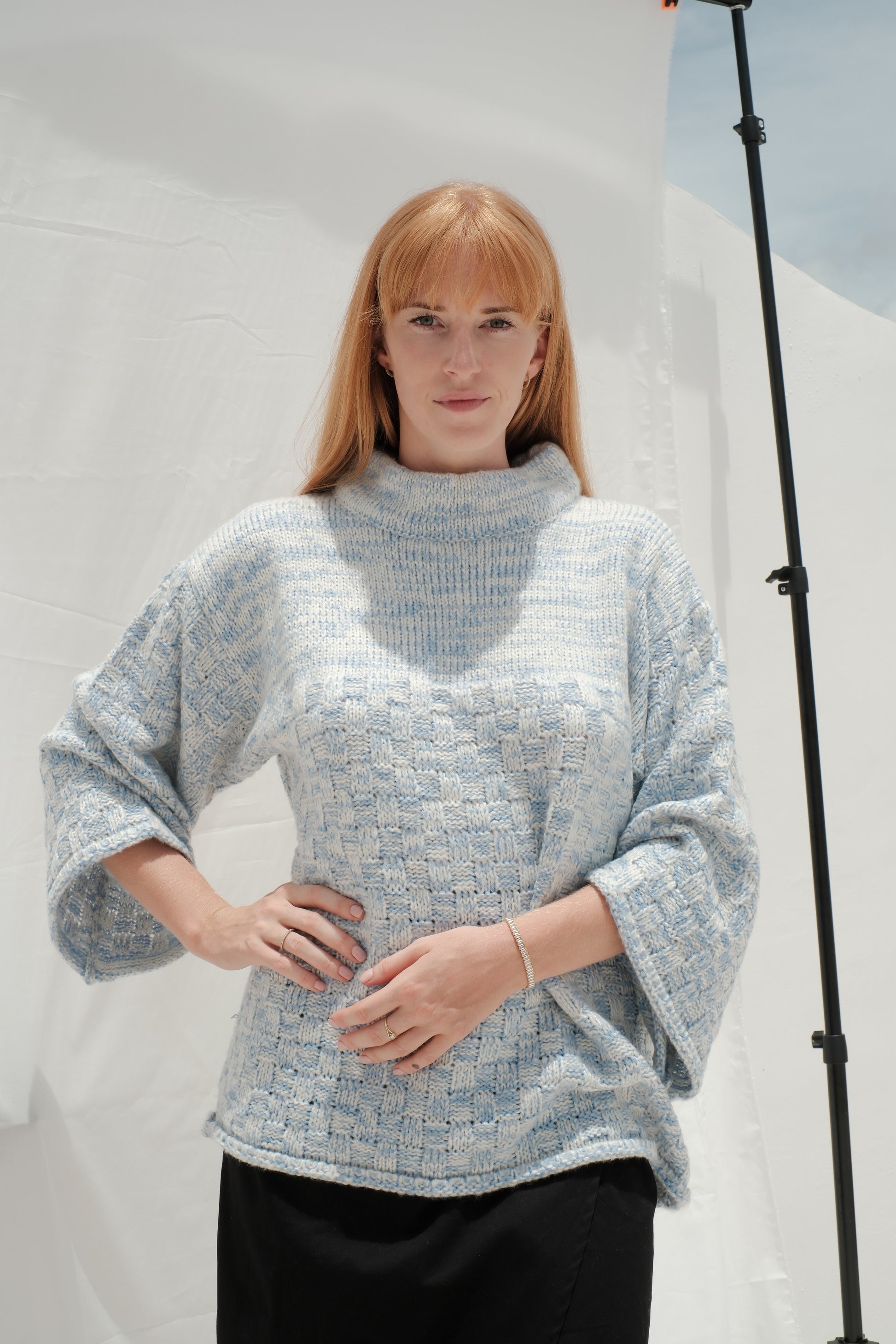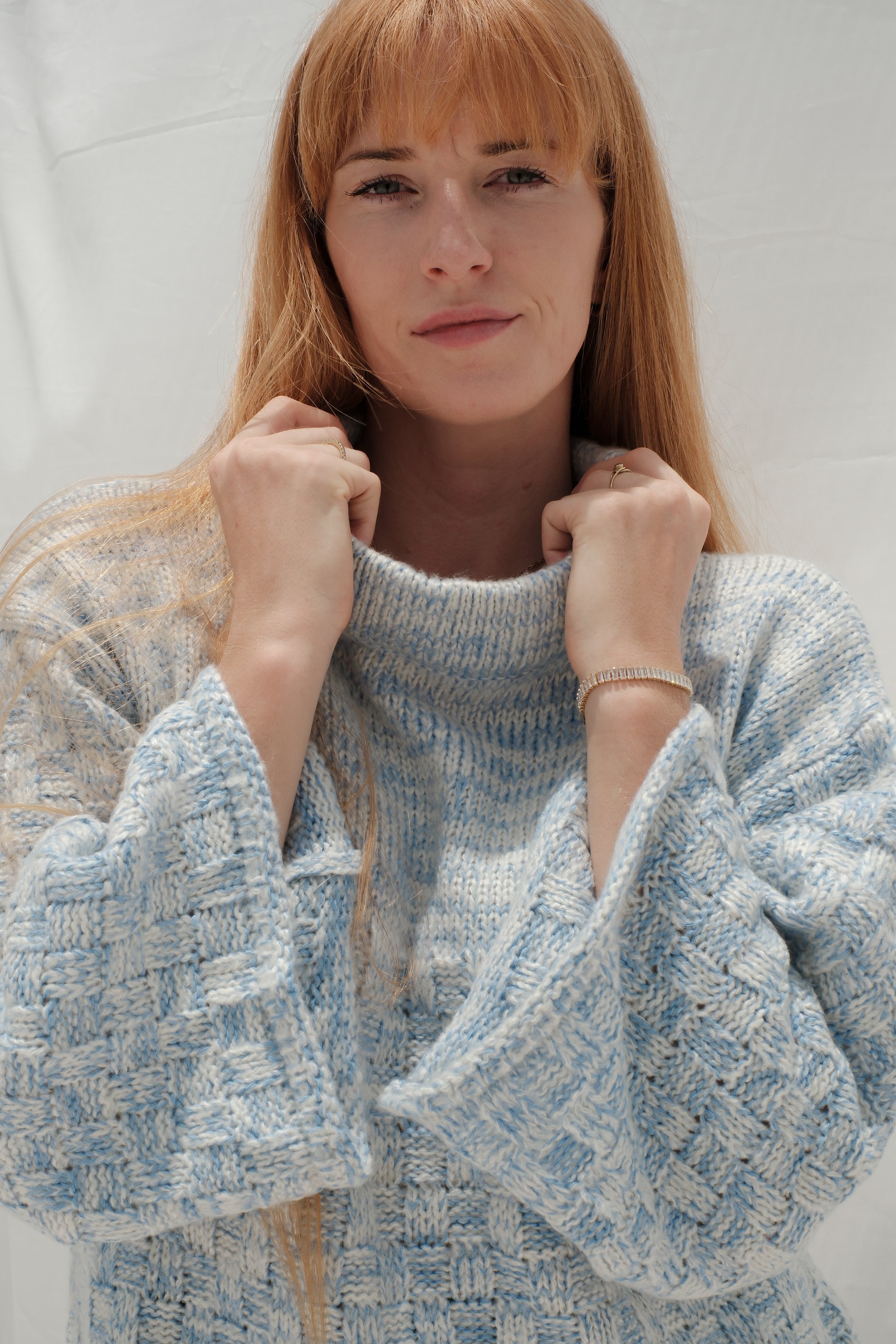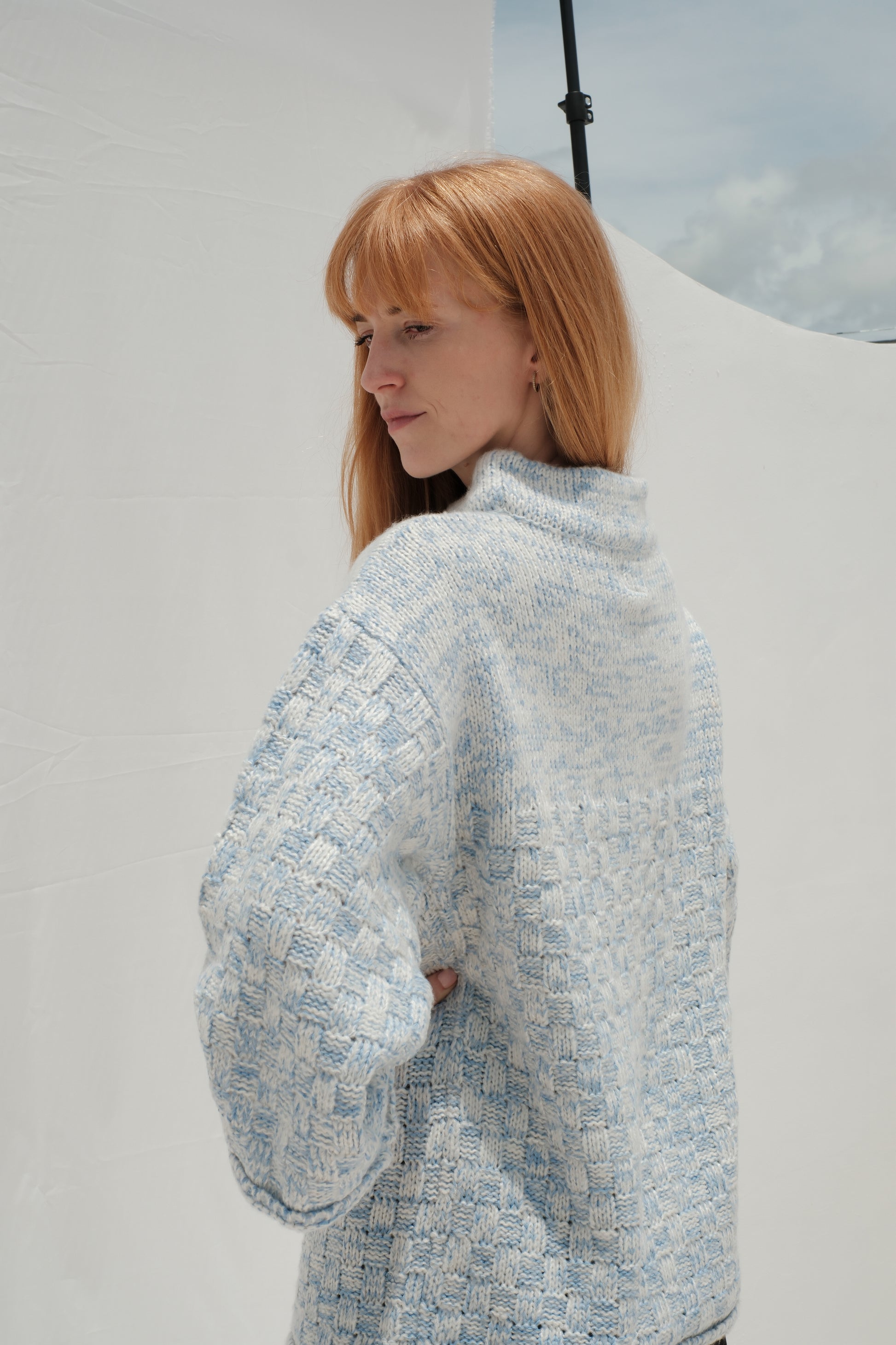 Tento modrý pletený svetr je vyrobený z kvalitní směsi 42 % vlny, 18 % mohéru a 40 % bavlny, díky které je hřejivý, jemný na dotek a zároveň prodyšný. Má výraznou plastickou strukturu a široké rukávy, které mu dodávají nadčasový, elegantní vzhled.