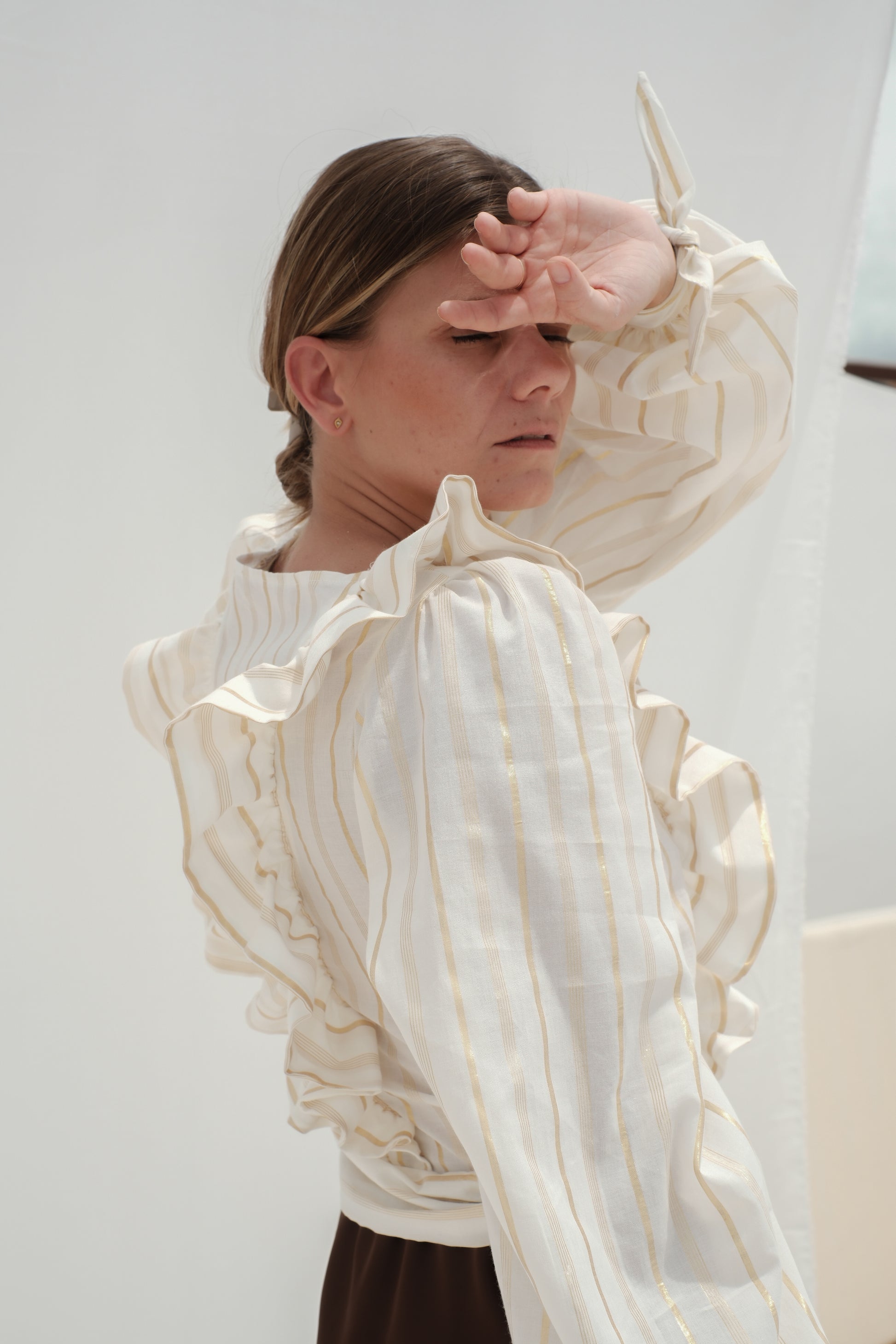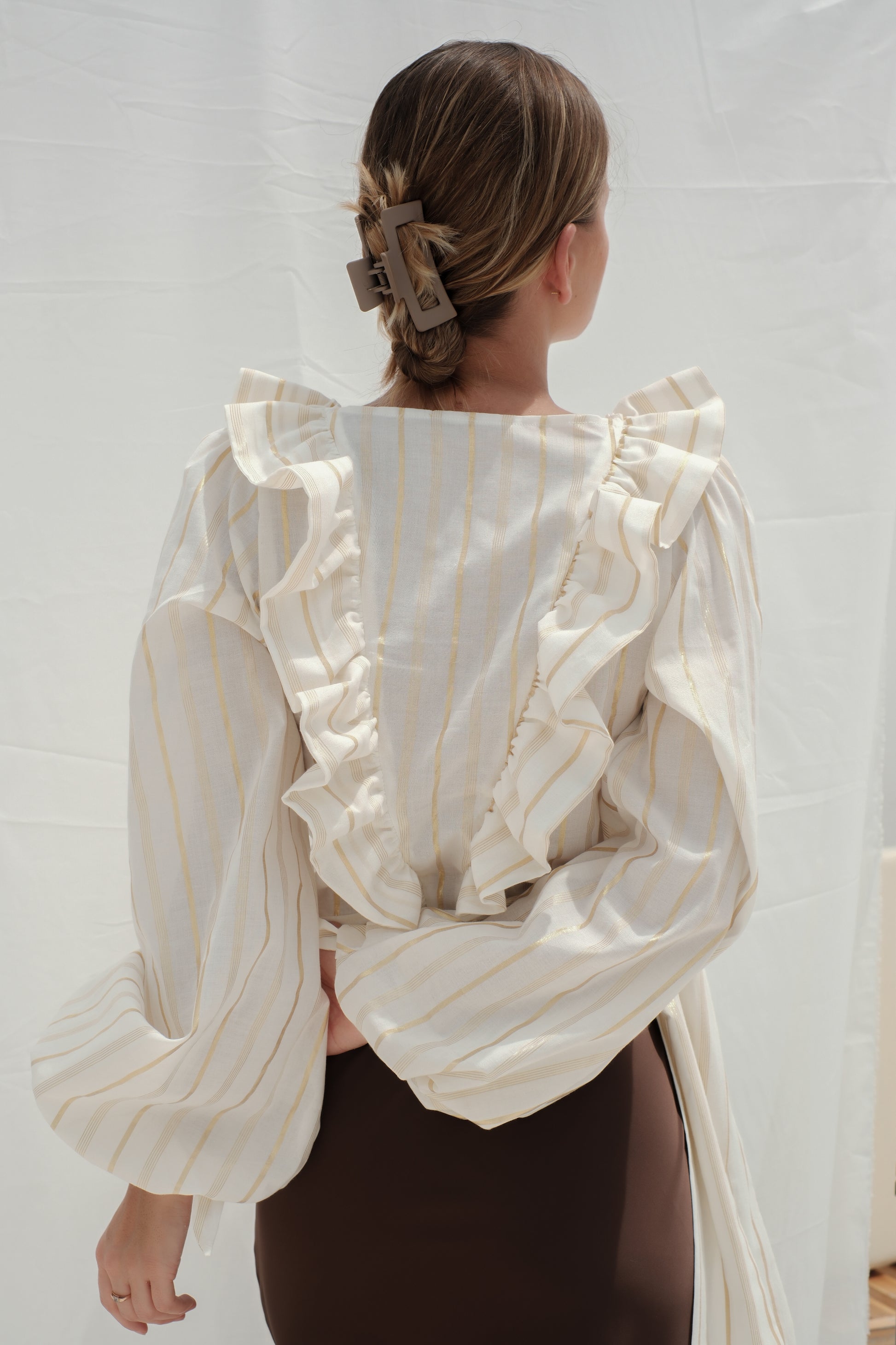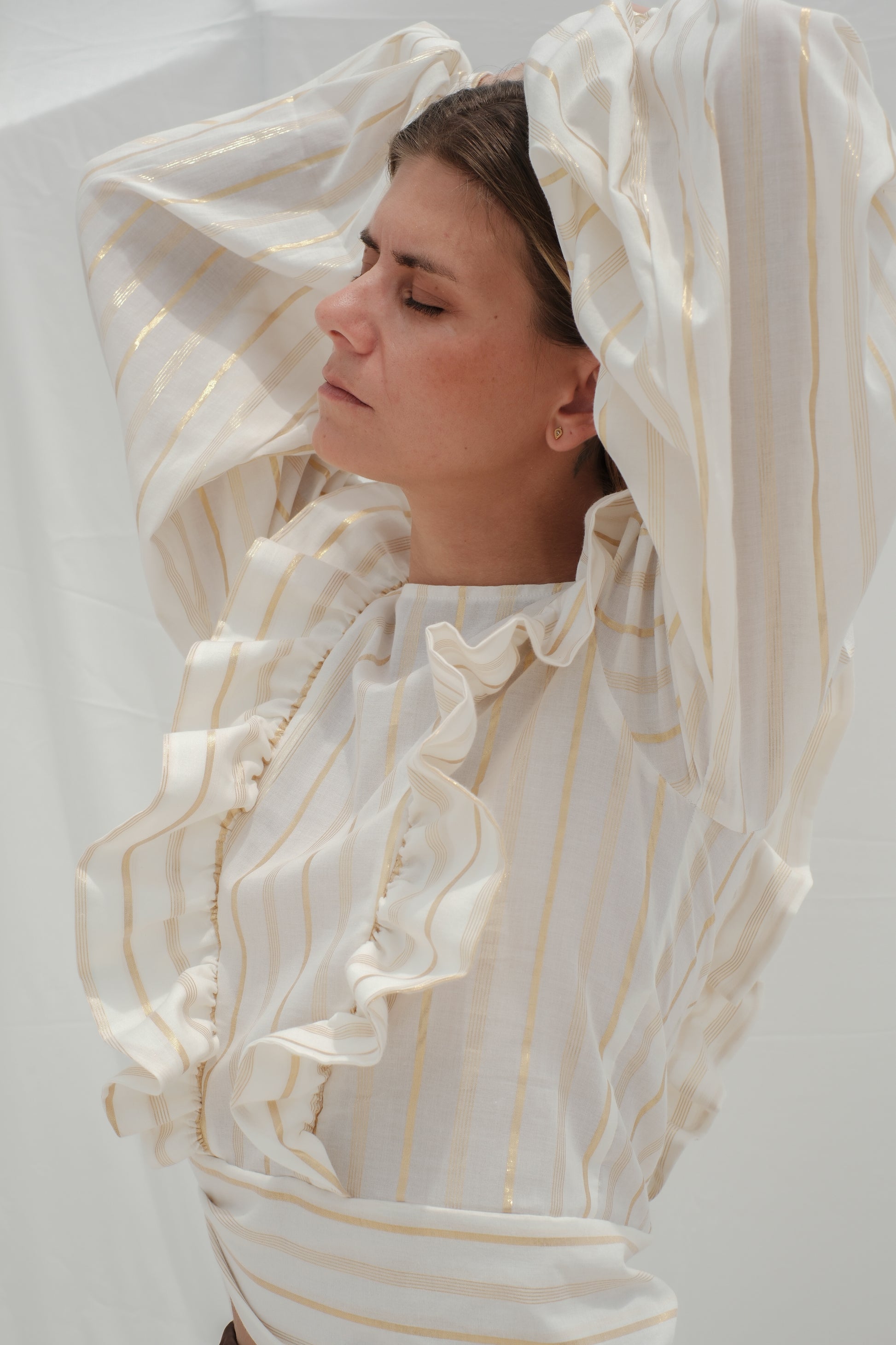 Tento bílo-zlatý top je ušitý ze stejné prémiové bavlny se zlatými pruhy, která mu dodává jemný, elegantní lesk. Má výrazné volánky na přední i zadní části a romantické balonové rukávy, které působí lehce, ženské a nadčasově.