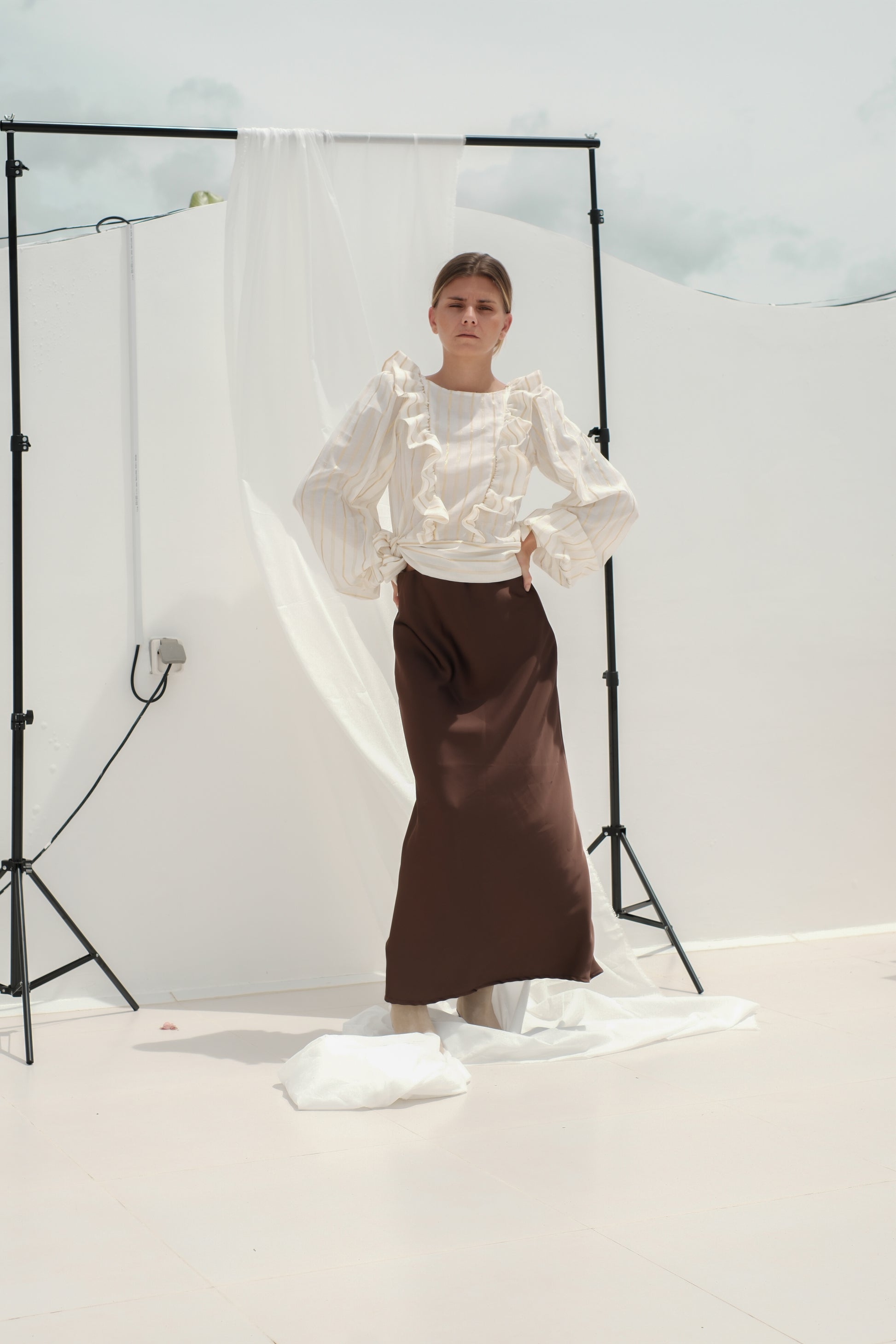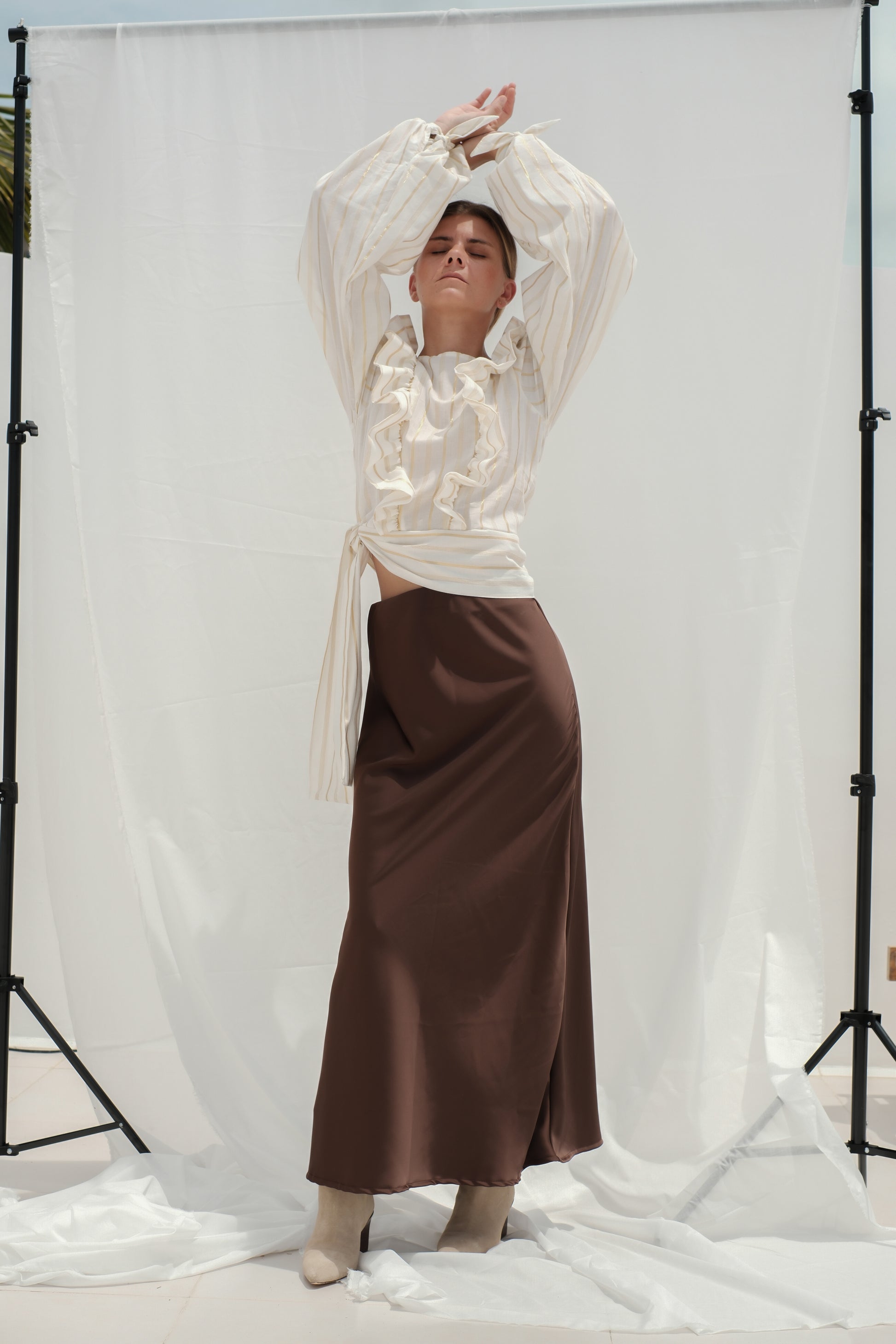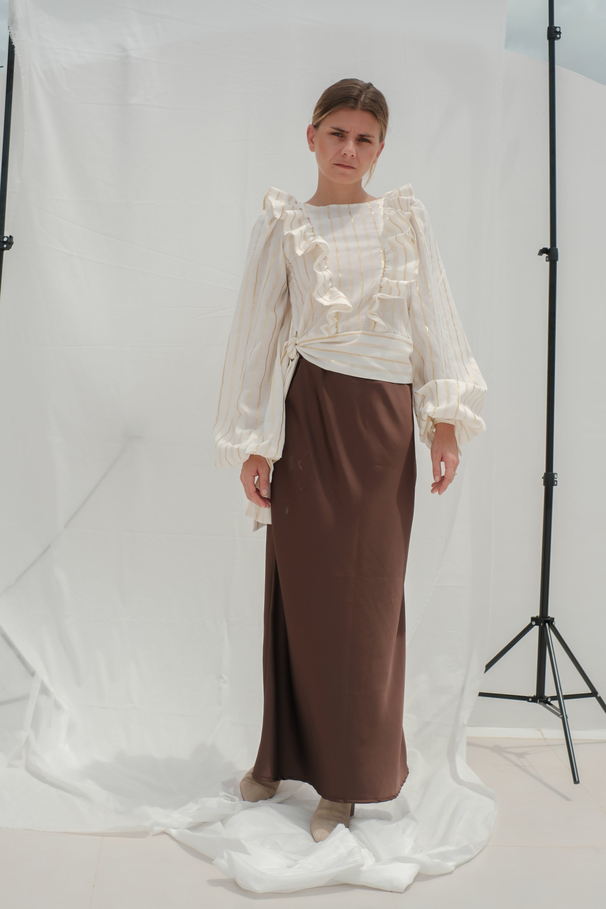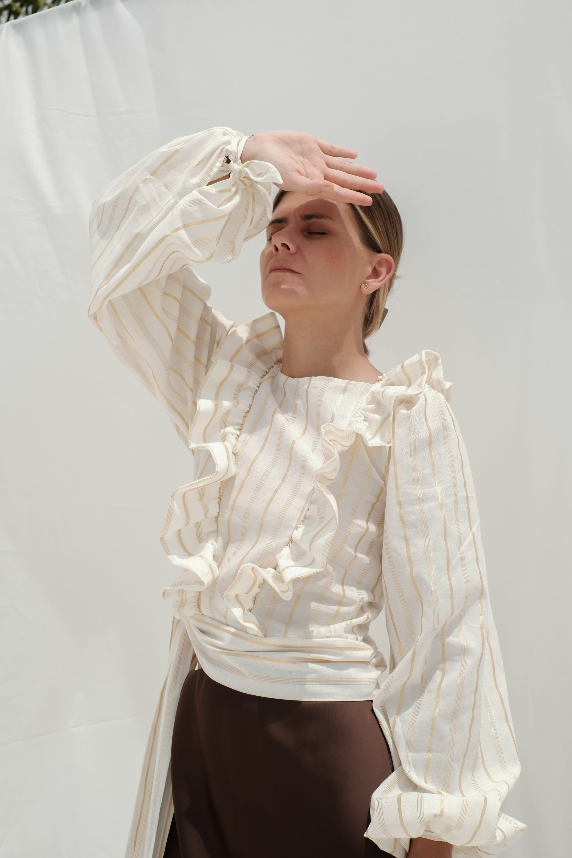 Tento bílo-zlatý top je ušitý ze stejné prémiové bavlny se zlatými pruhy, která mu dodává jemný, elegantní lesk. Má výrazné volánky na přední i zadní části a romantické balonové rukávy, které působí lehce, ženské a nadčasově.