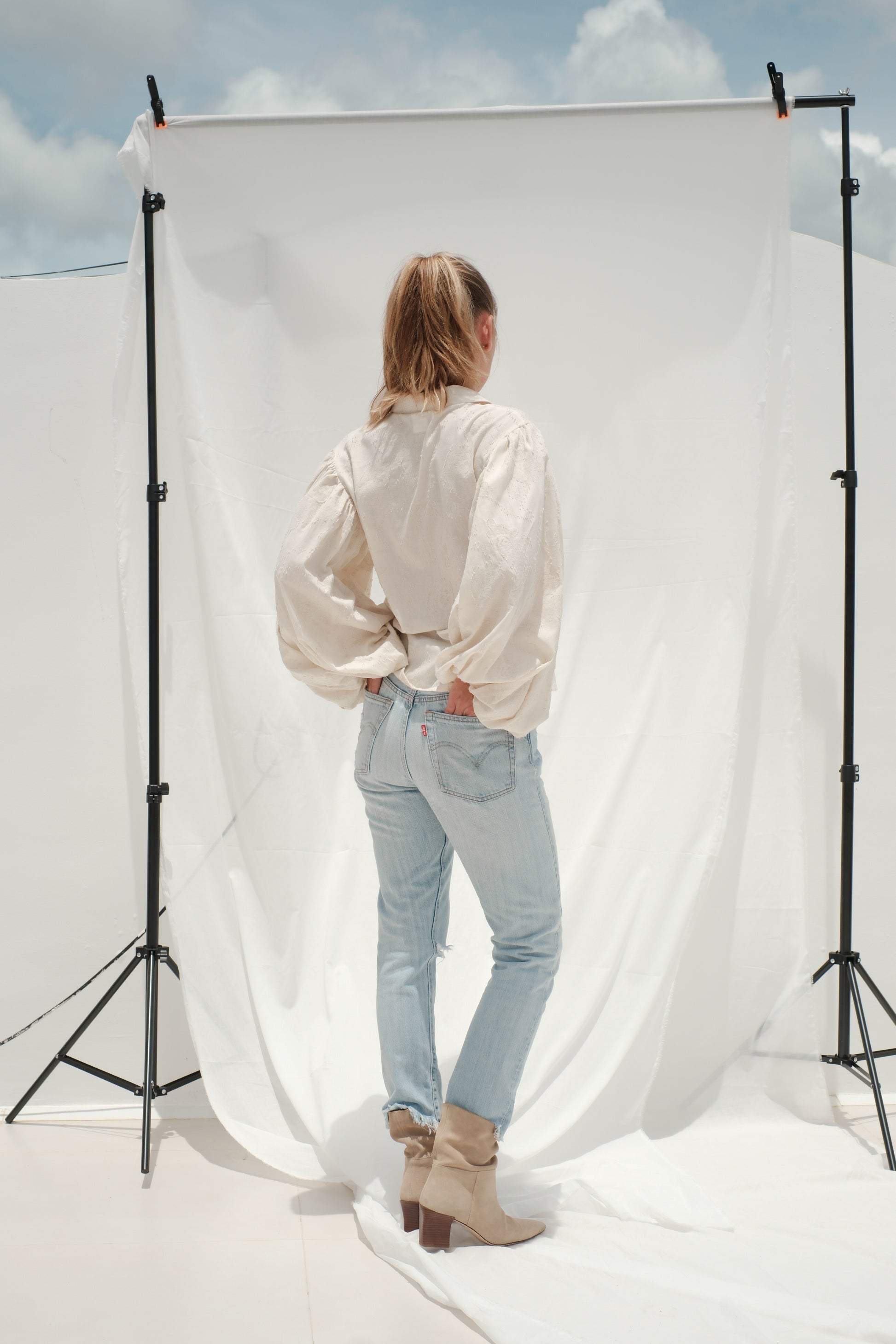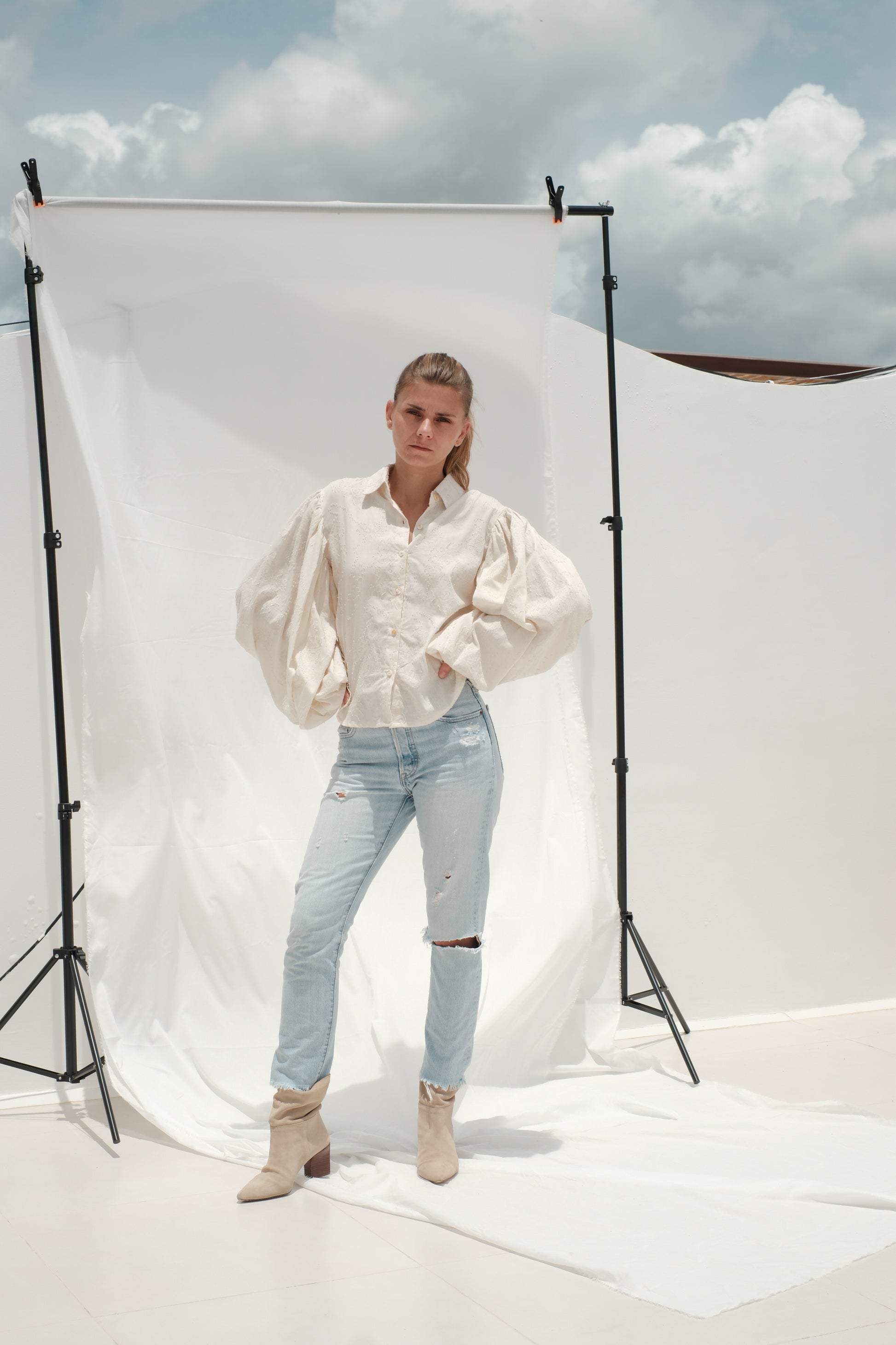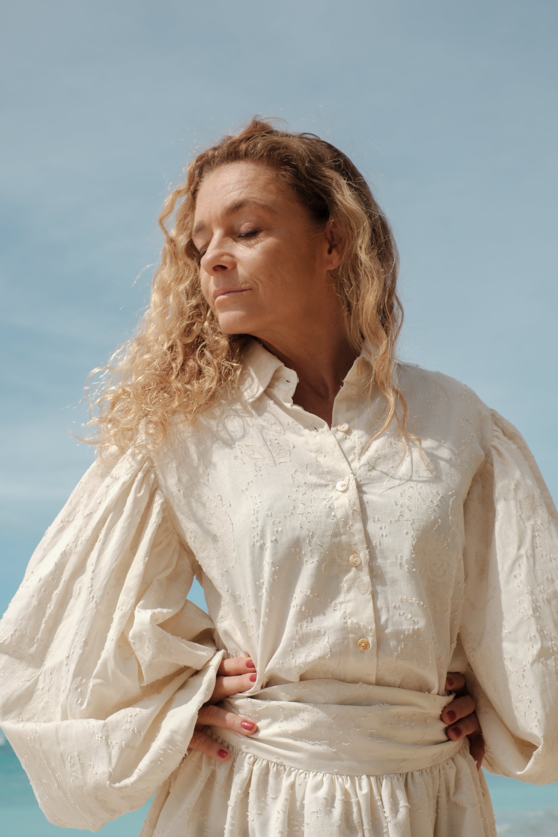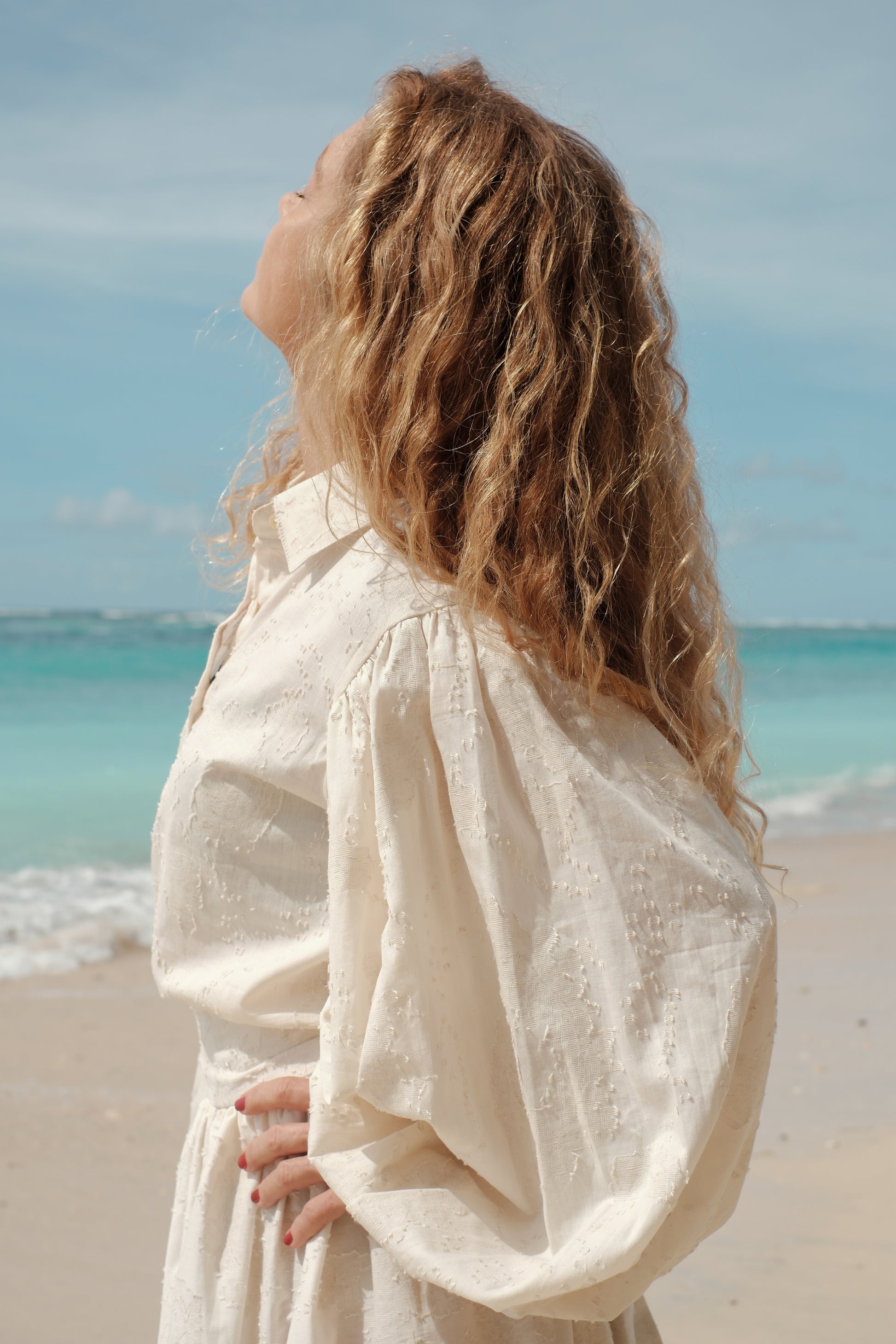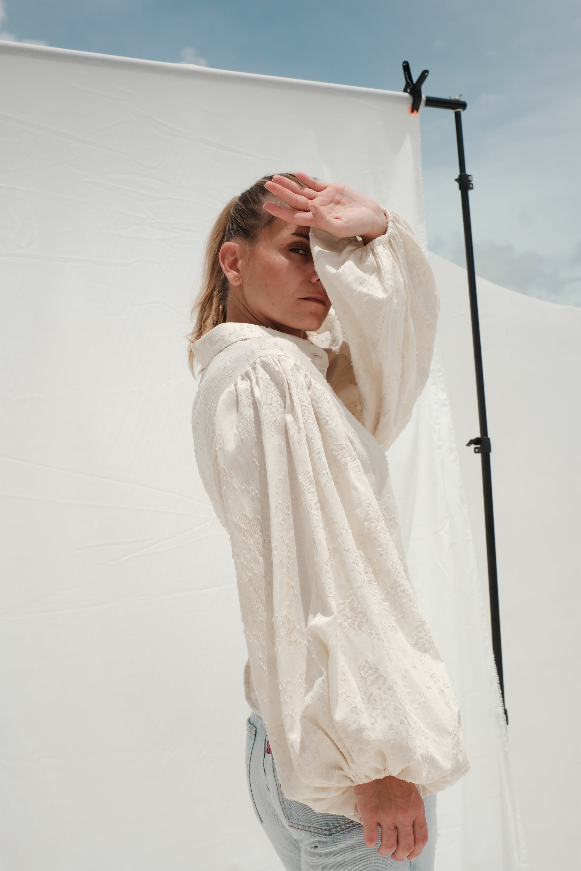 Tato krémová žakárová košile je ušitá z prémiové směsi 22 % lnu, 18 % rayonu a 60 % bavlny, která je příjemná na těle, prodyšná a díky žakárové struktuře působí luxusně a originálně. Výrazné balonové rukávy dodávají košili elegantní siluetu a tvoří z ní výrazný, ale stále velmi nositelný kousek do šatníku.
