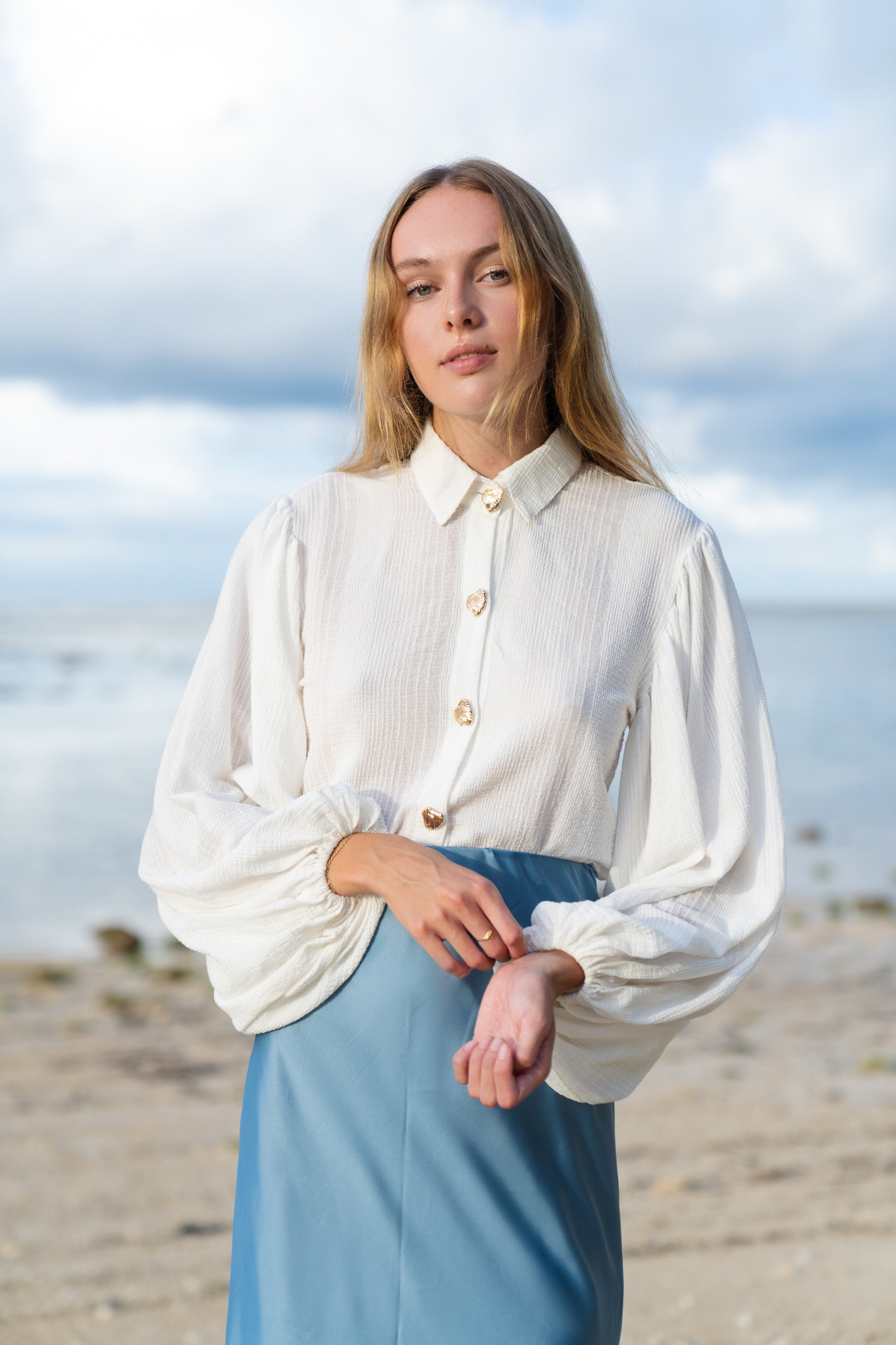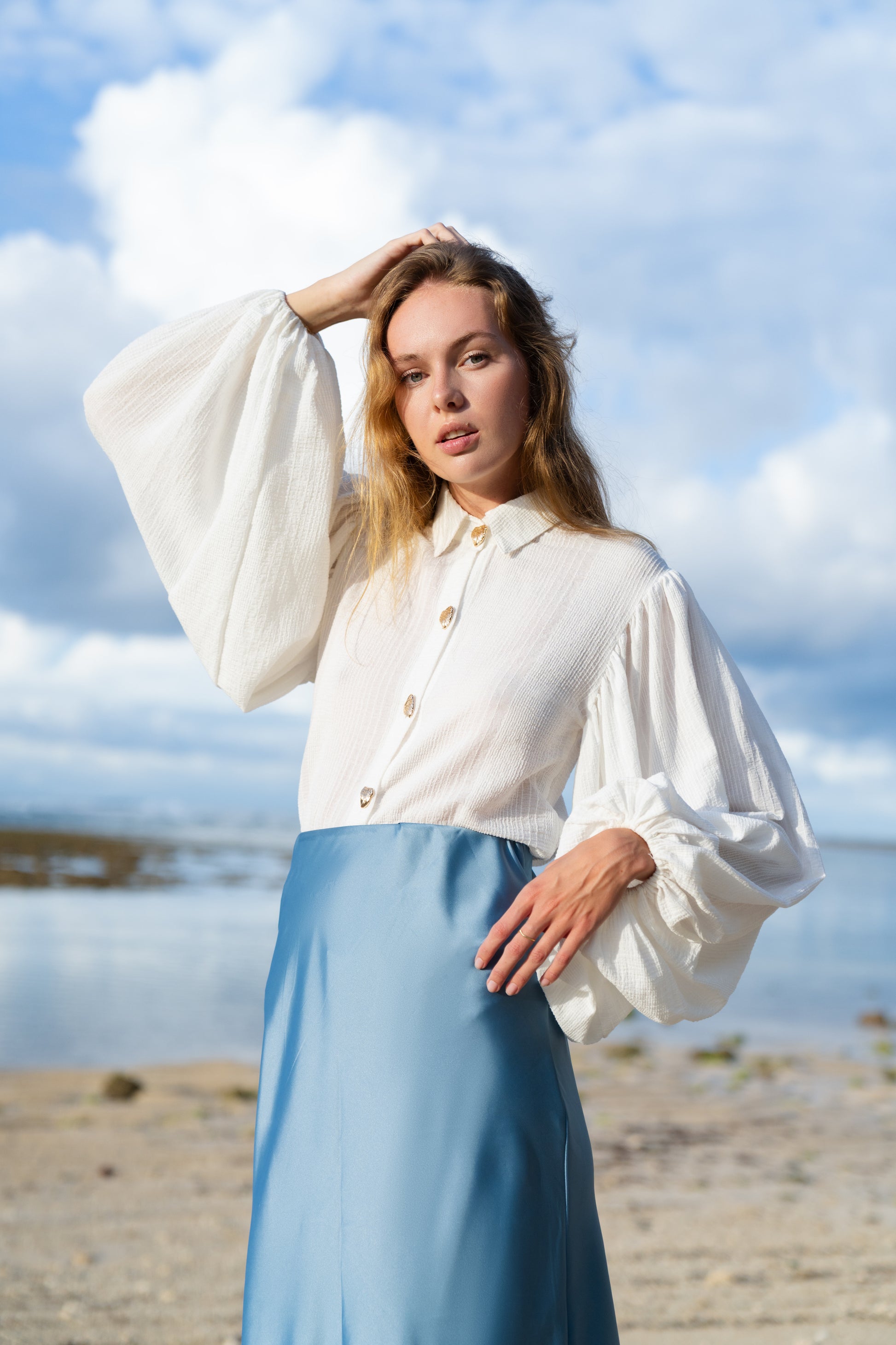 Tato bílá žakárová košile je ušitá z prémiové směsi 30 % rayonu a 70 % bavlny, která je příjemná na těle, prodyšná a díky žakárové struktuře působí luxusně a originálně. Výrazné balonové rukávy dodávají košili elegantní siluetu a tvoří z ní výrazný, ale stále velmi nositelný kousek do šatníku.