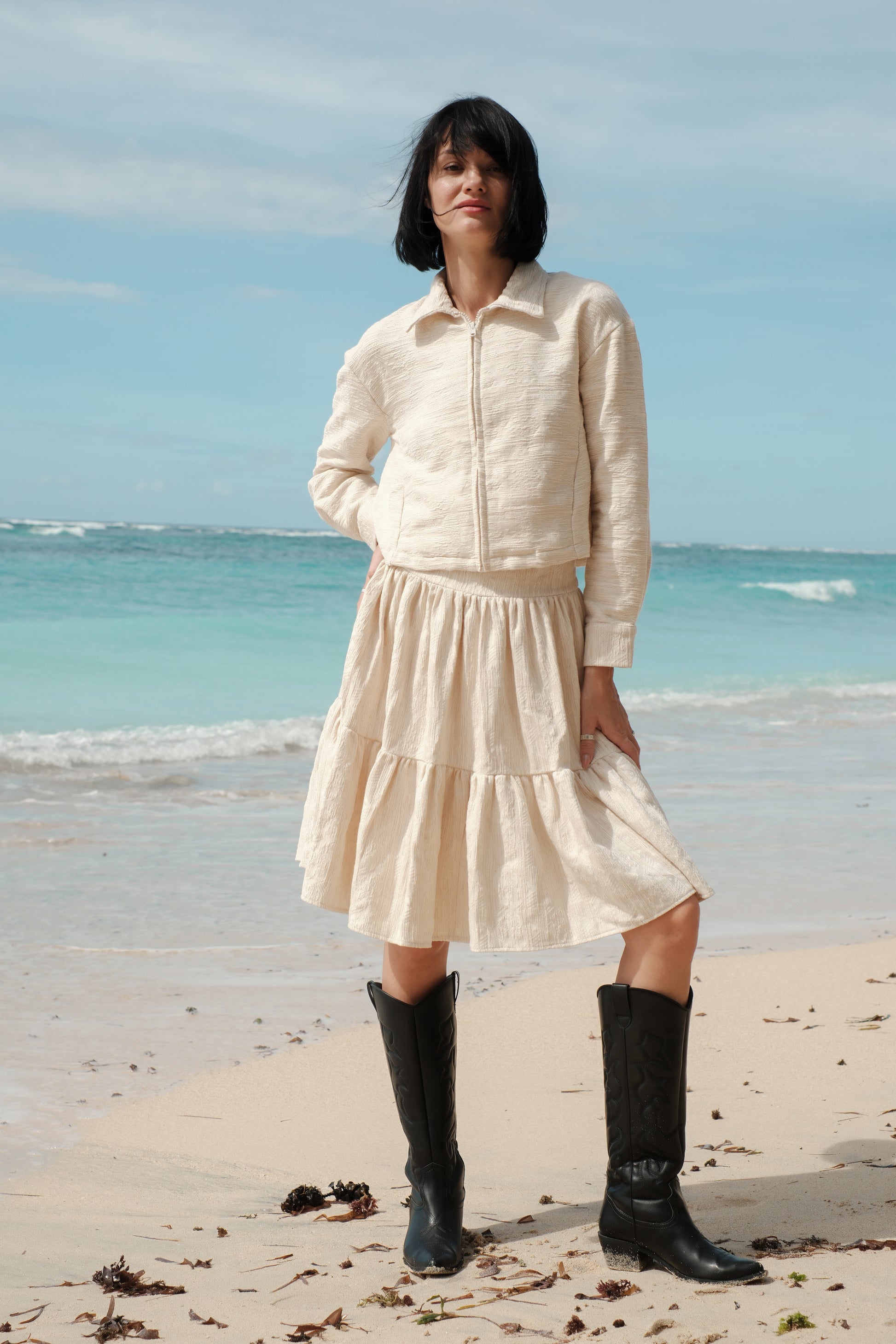 Tato krémová řasená sukně je ušitá z měkkého a teplejšího žakáru s podílem 90 % bavlny a 10 % lnu. Materiál má jemnou strukturu, krásně splývá a zároveň drží tvar.