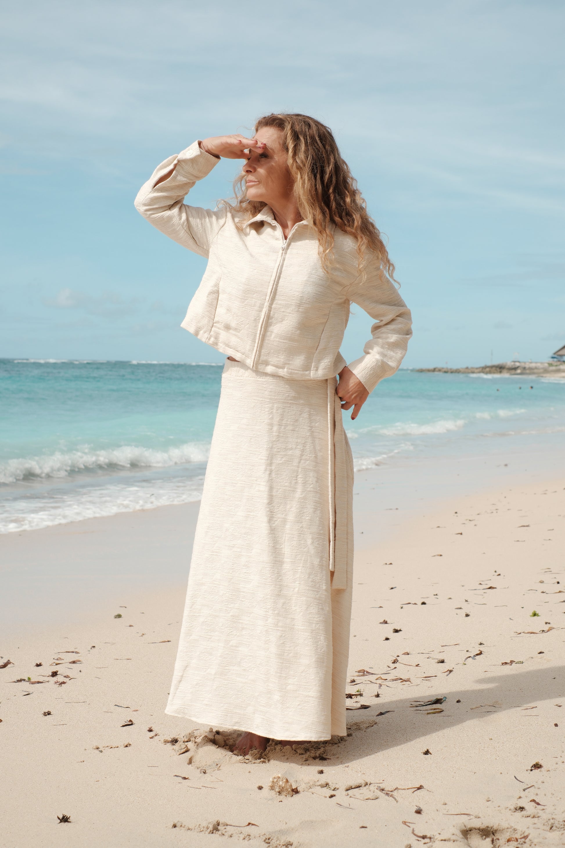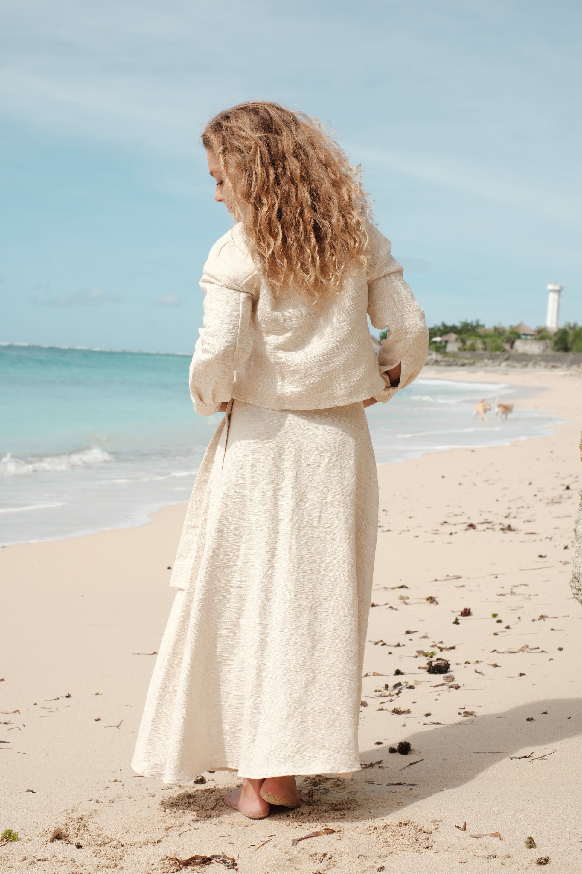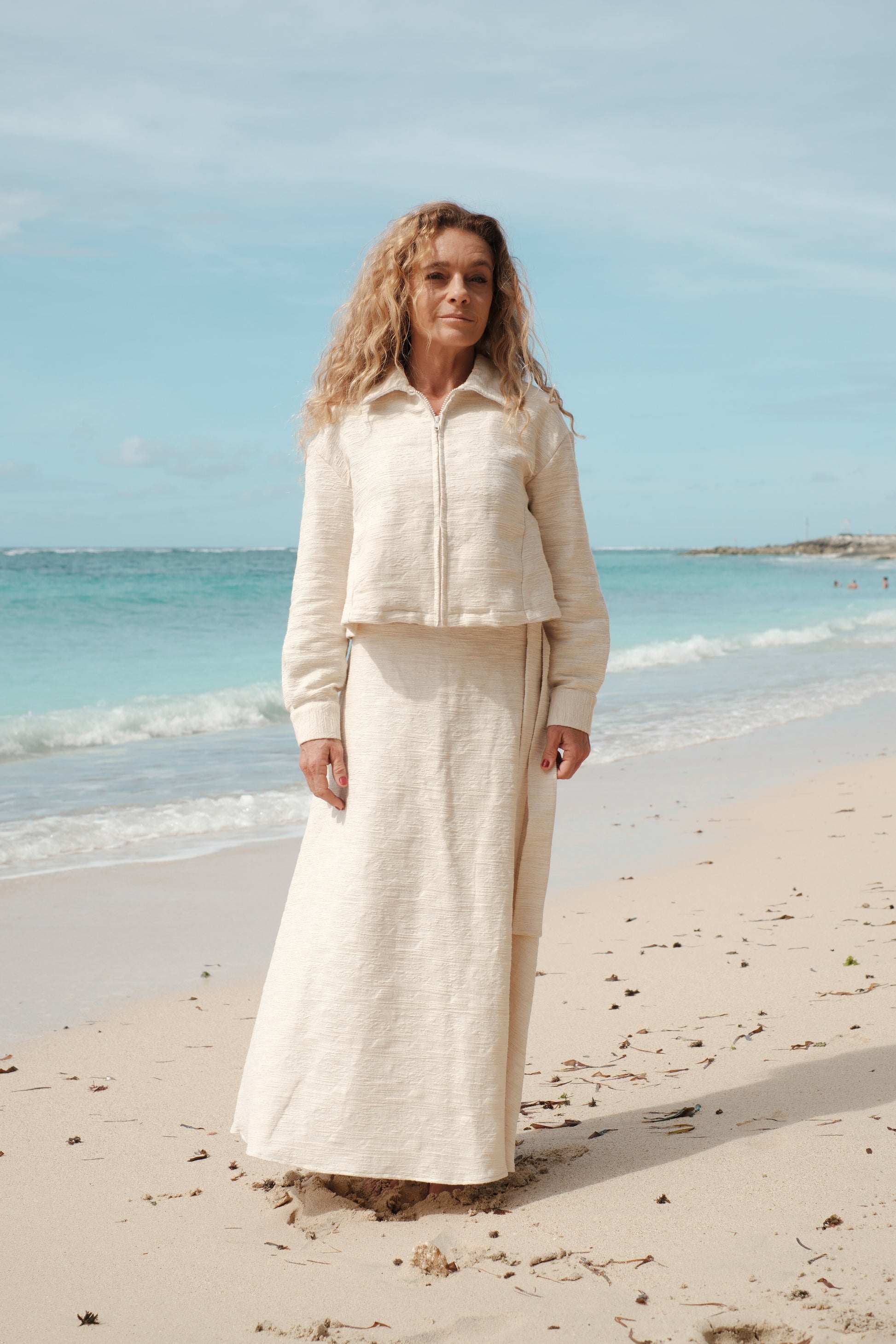 Tato krémová dlouhá sukně je ušitá z teplého a měkkého žakáru s podílem 90 % bavlny a 10 % lnu. Materiál má jemnou strukturu, působí luxusně a zároveň je velmi pohodlný na každodenní nošení.