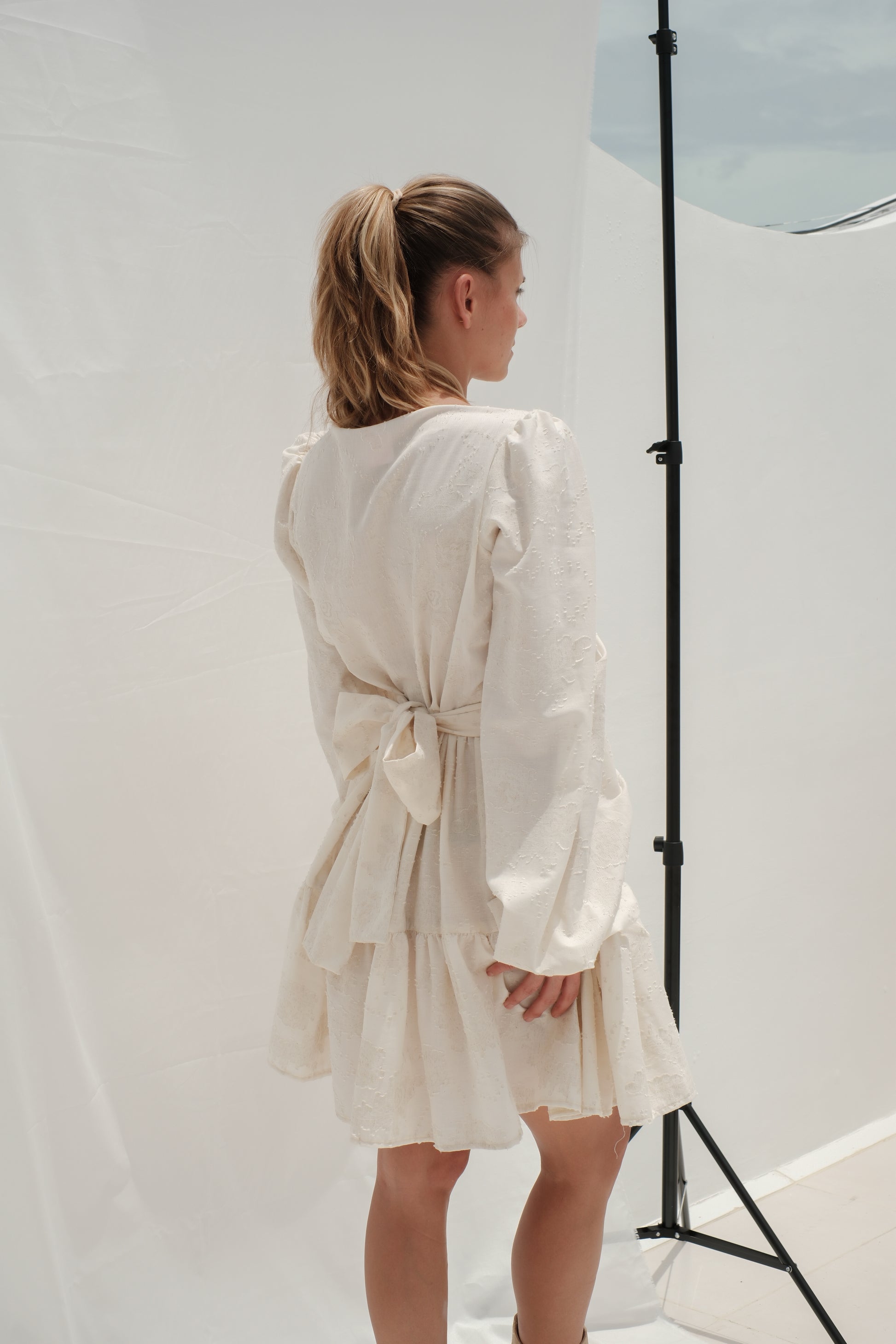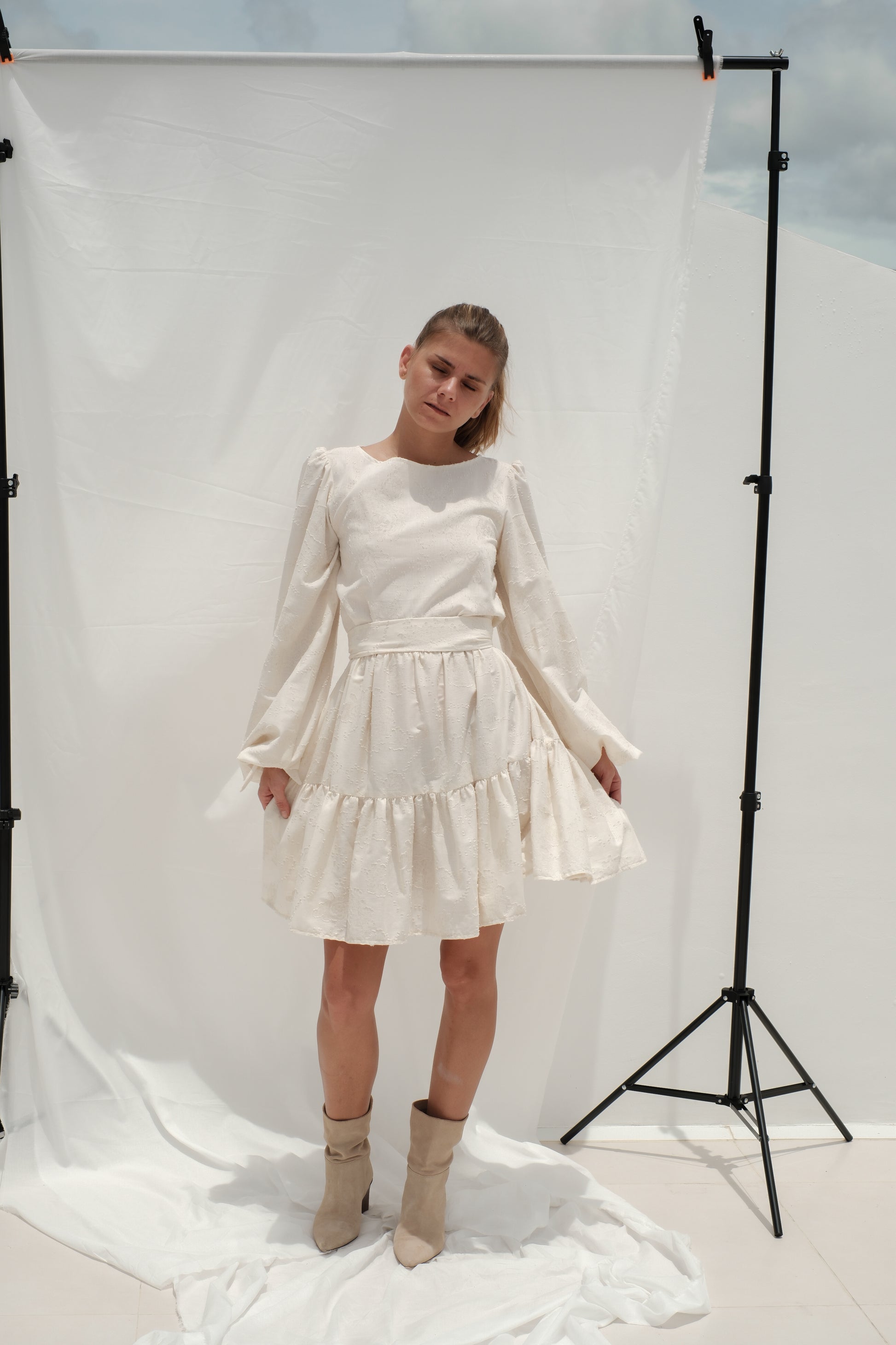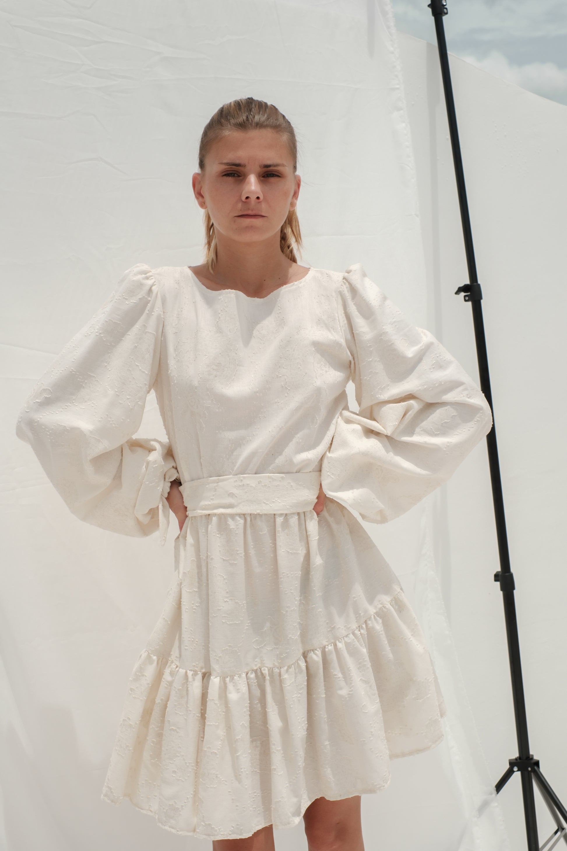 Šaty mají výrazné balonové rukávy, pohodlný řasený střih a široký pásek, který krásně zvýrazní pas. Dvě řasené sukně dodávají šatům objem a romantický vzhled, zatímco žakárový vzor působí luxusně a nadčasově.