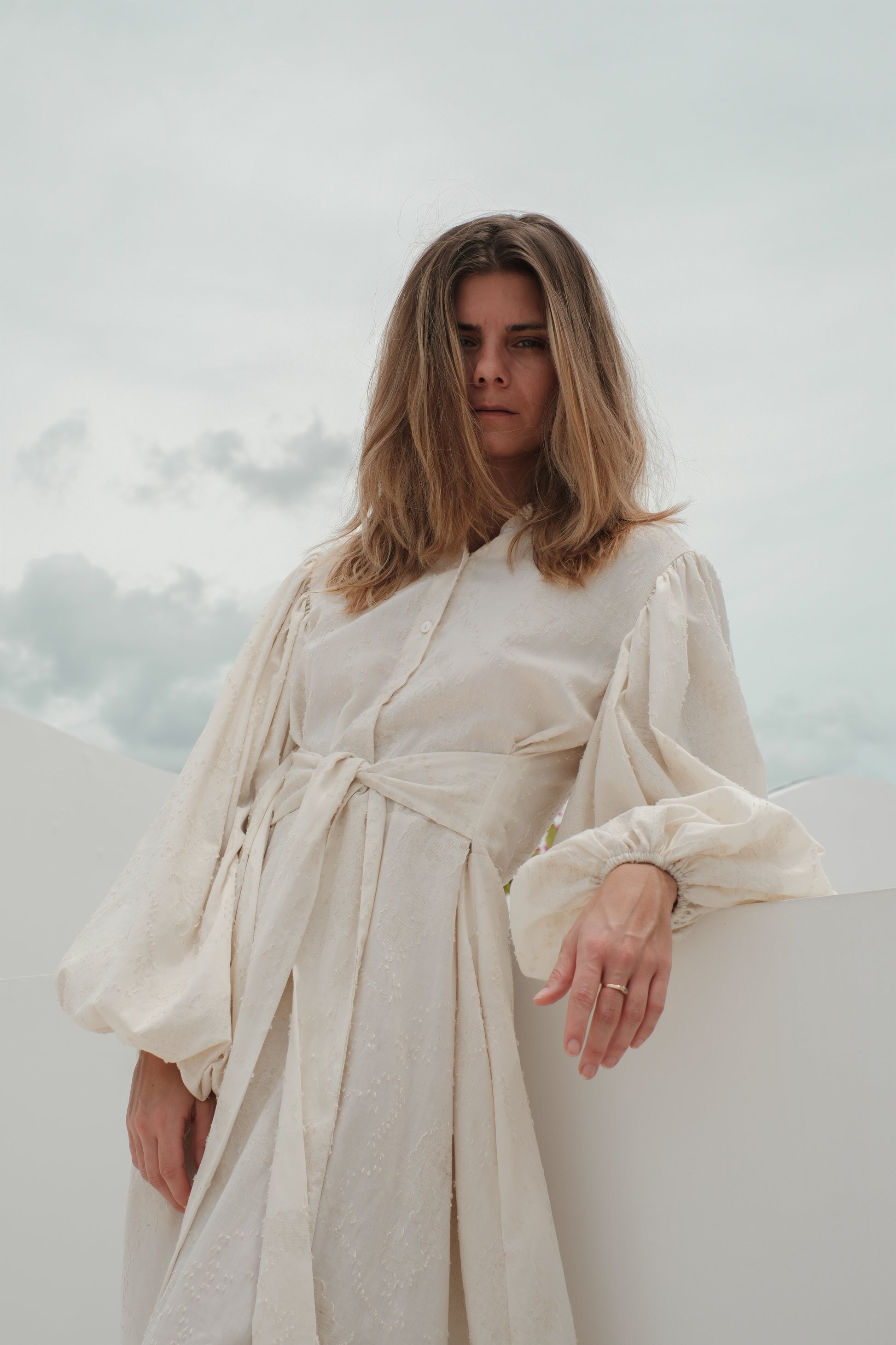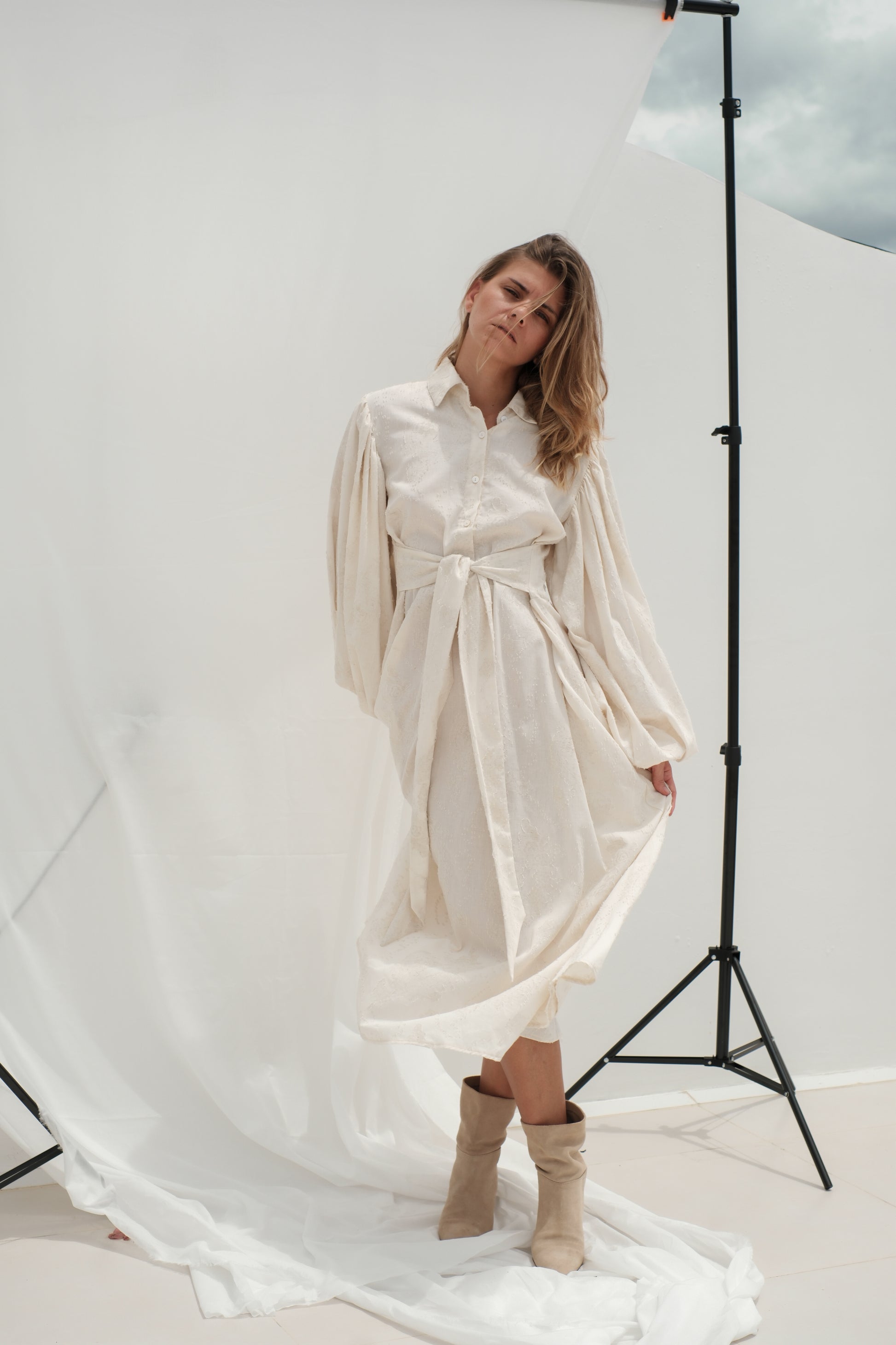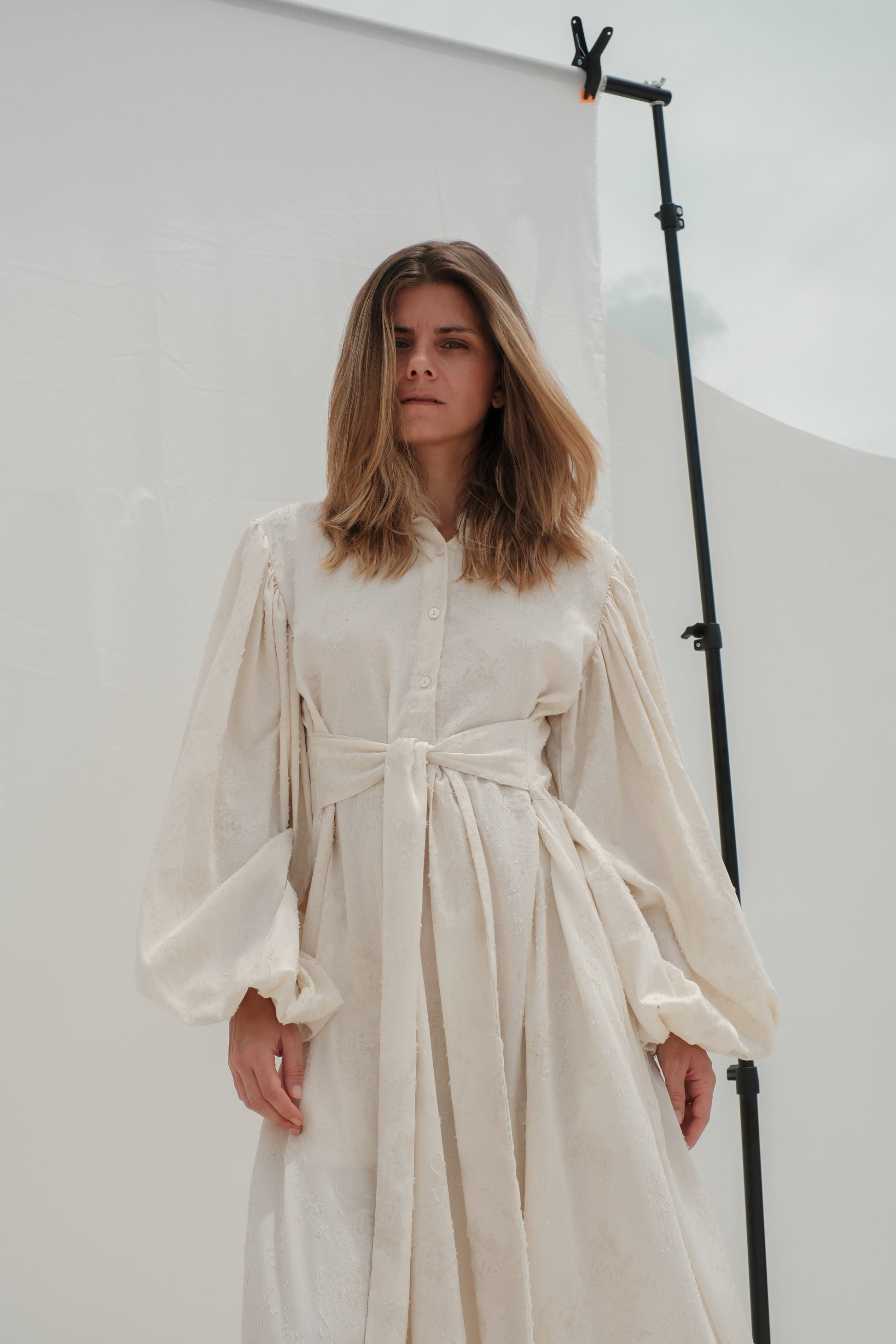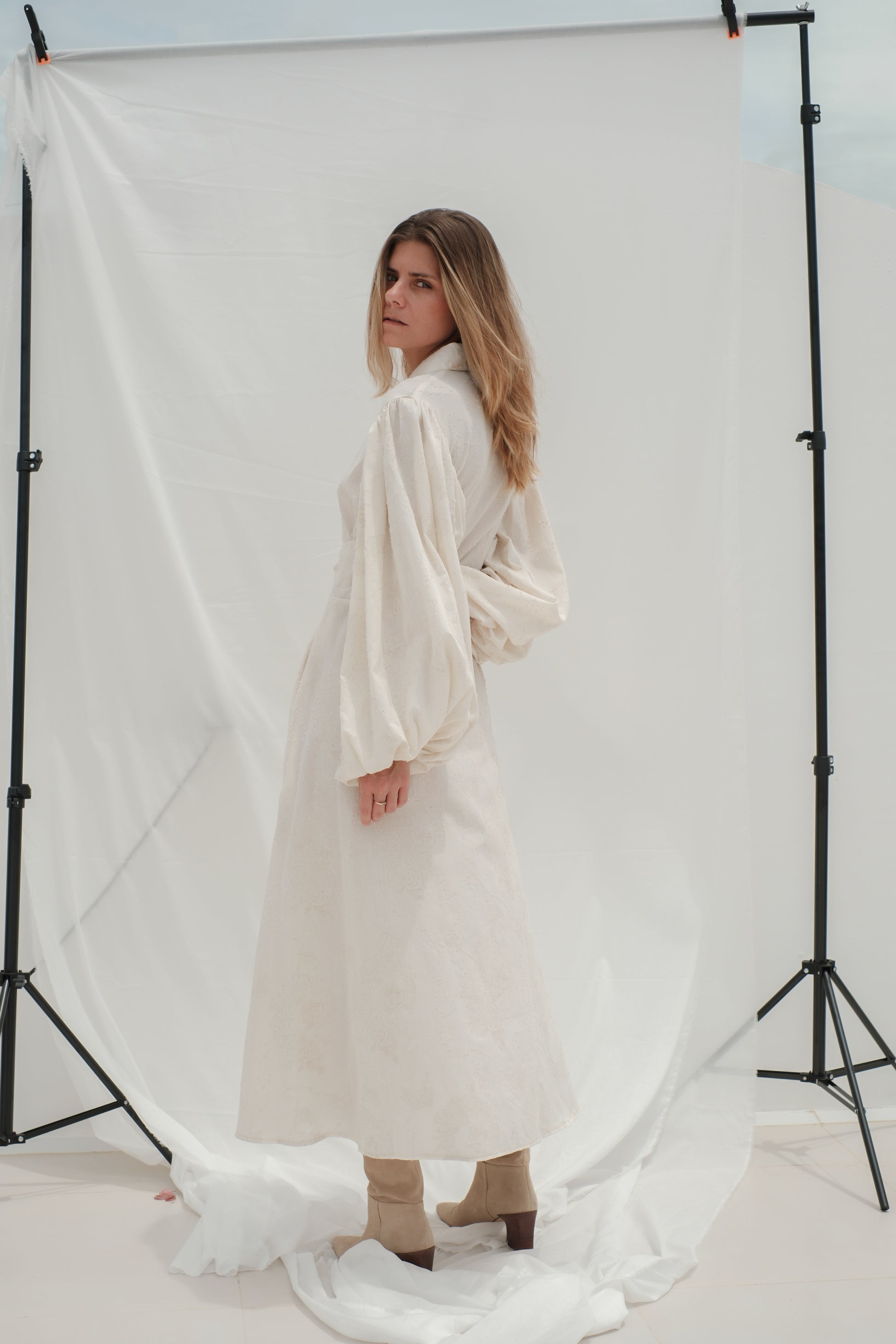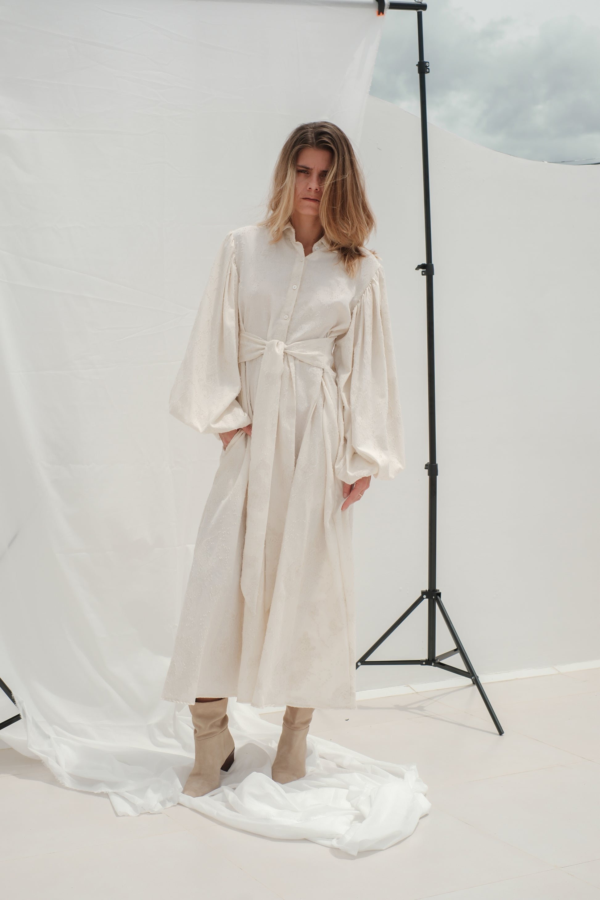 Tyto košilové maxi šaty jsou ušité z luxusního světle krémového žakáru s jemnou strukturou, která dodává látce elegantní a sofistikovaný vzhled. Horní část má košilový střih se zapínáním na knoflíky a výrazné balonové rukávy, které vytvářejí romantickou a současně moderní siluetu.