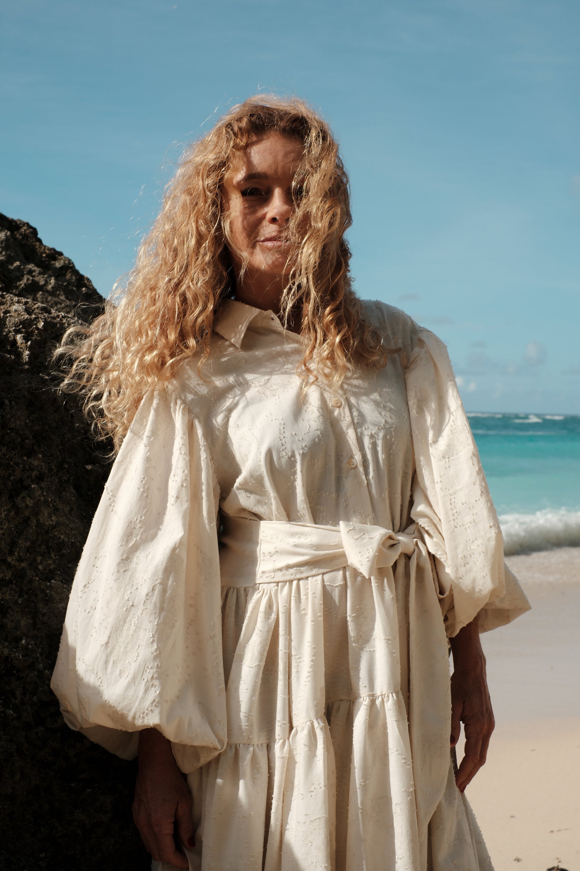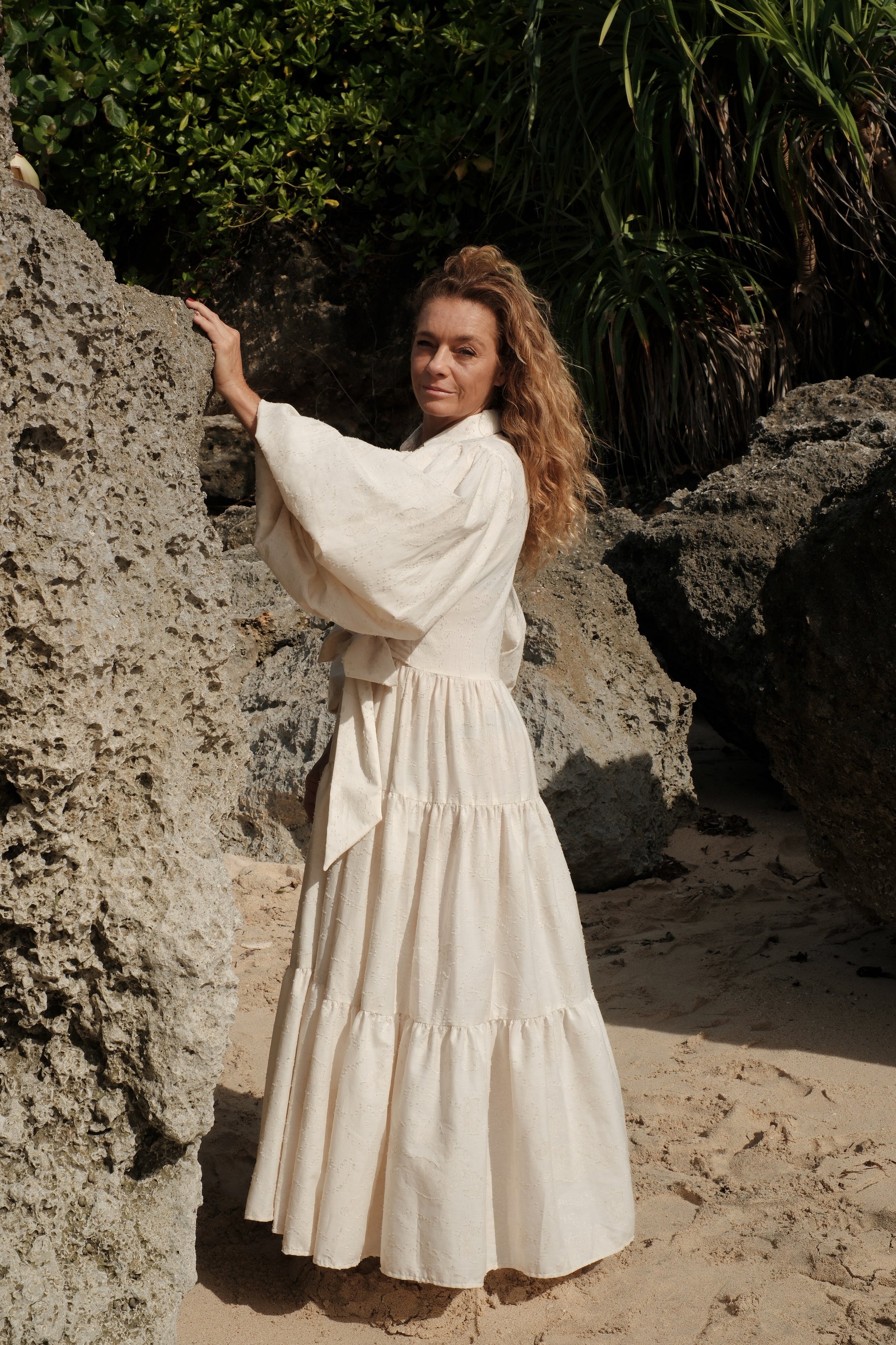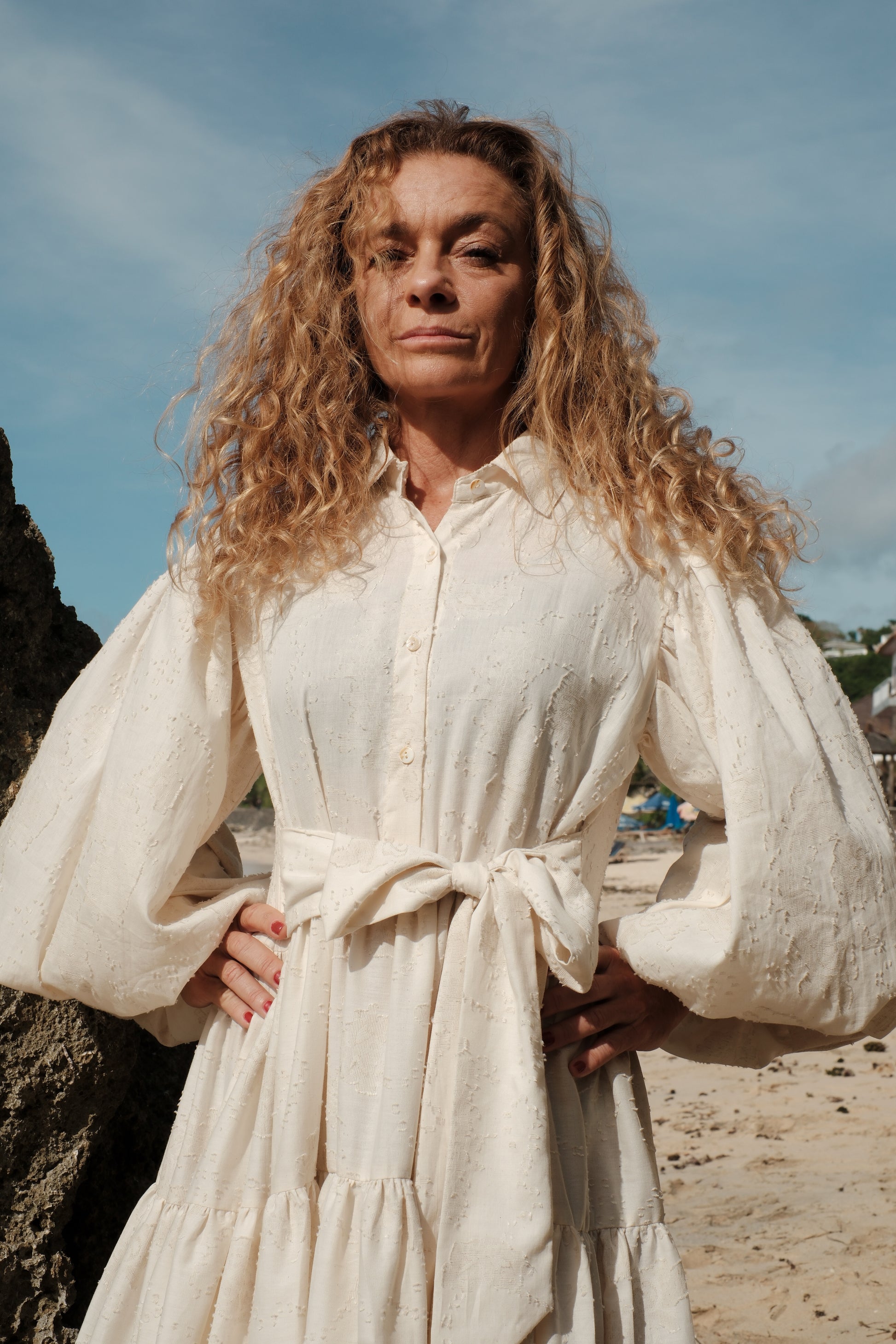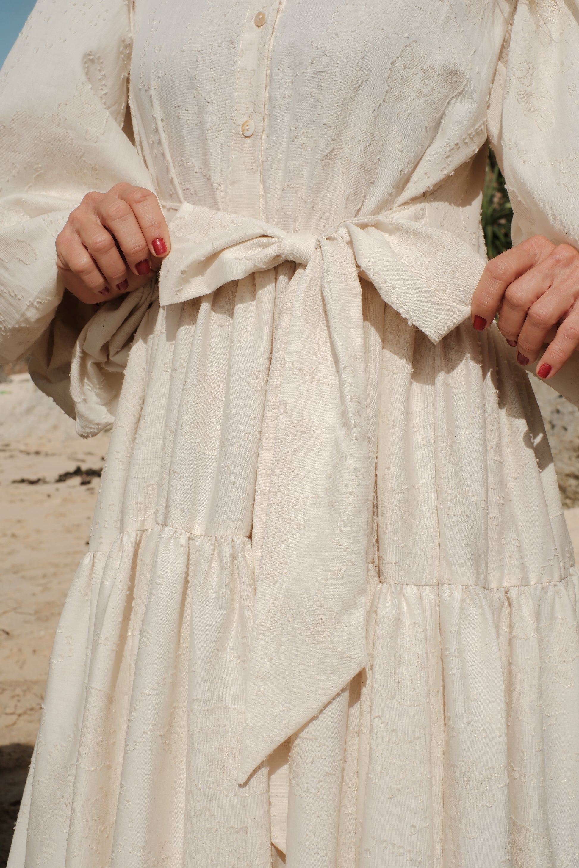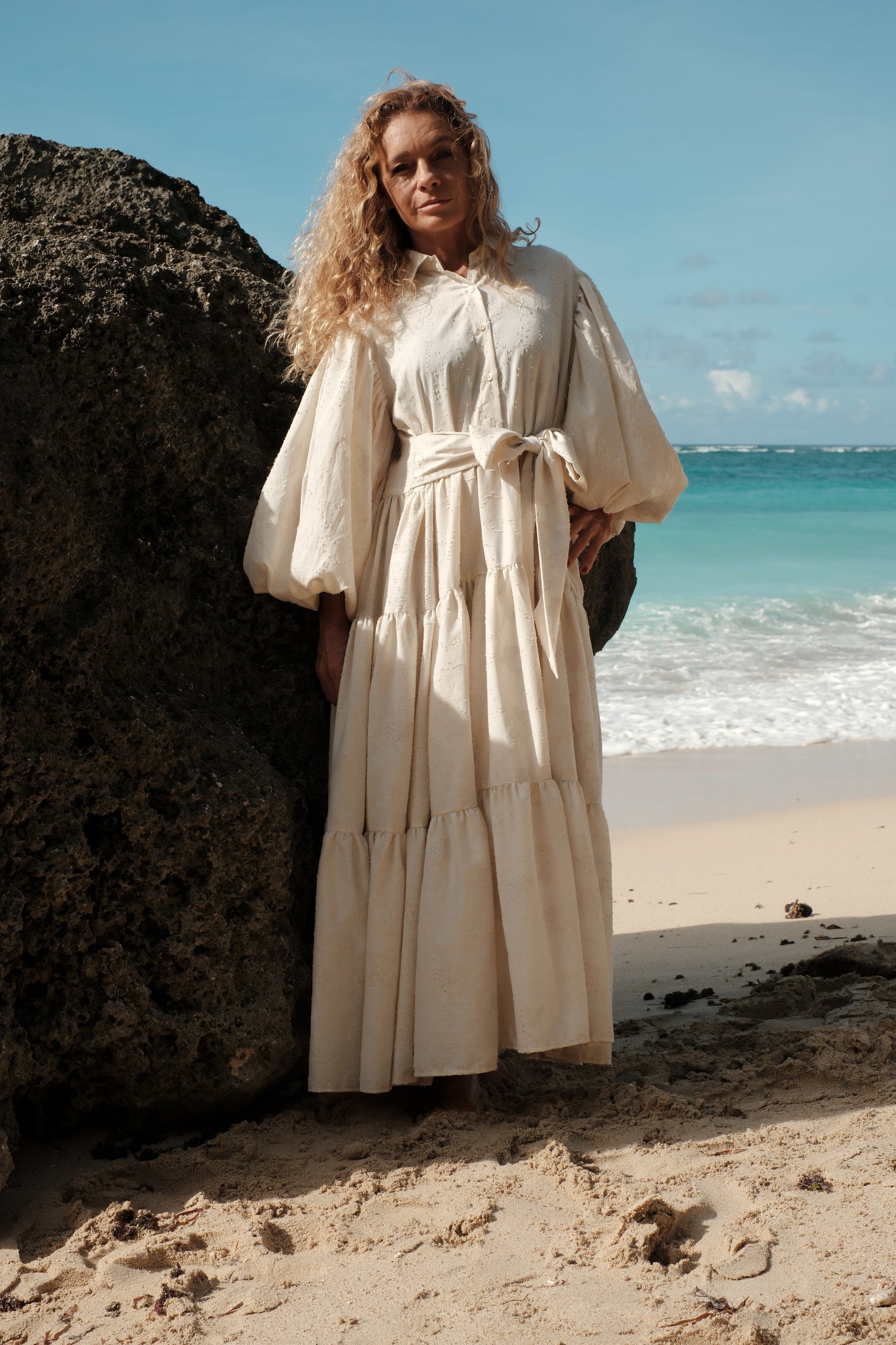 Tyto košilové maxi šaty jsou ušité z elegantního žakáru ve světle krémovém odstínu. Látka má jemnou strukturu, působí luxusně a díky směsi přírodních vláken je příjemná a prodyšná. Šaty mají klasický košilový střih, zapínání na knoflíky a výrazné balonové rukávy, které vytvářejí krásnou ženskou siluetu.