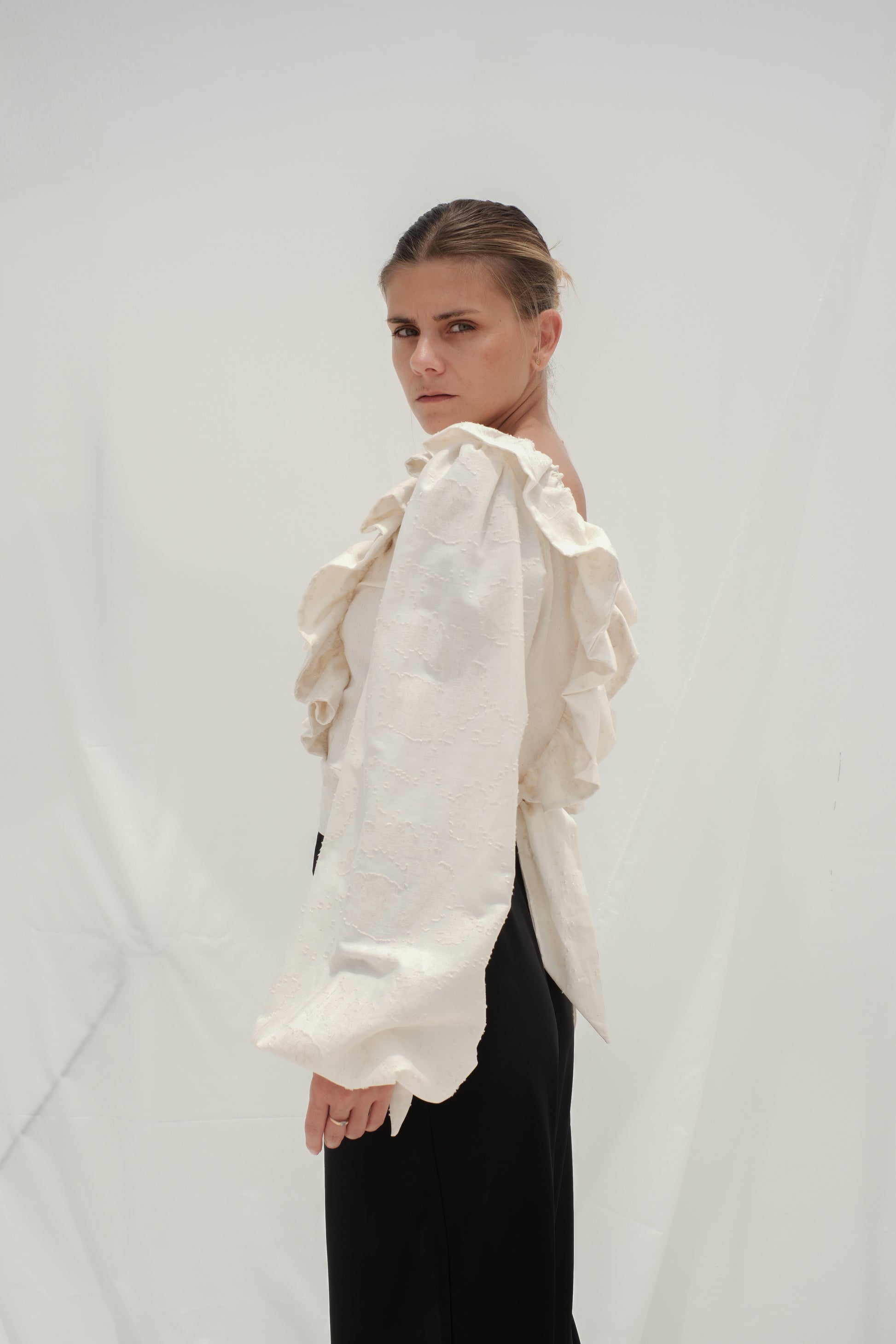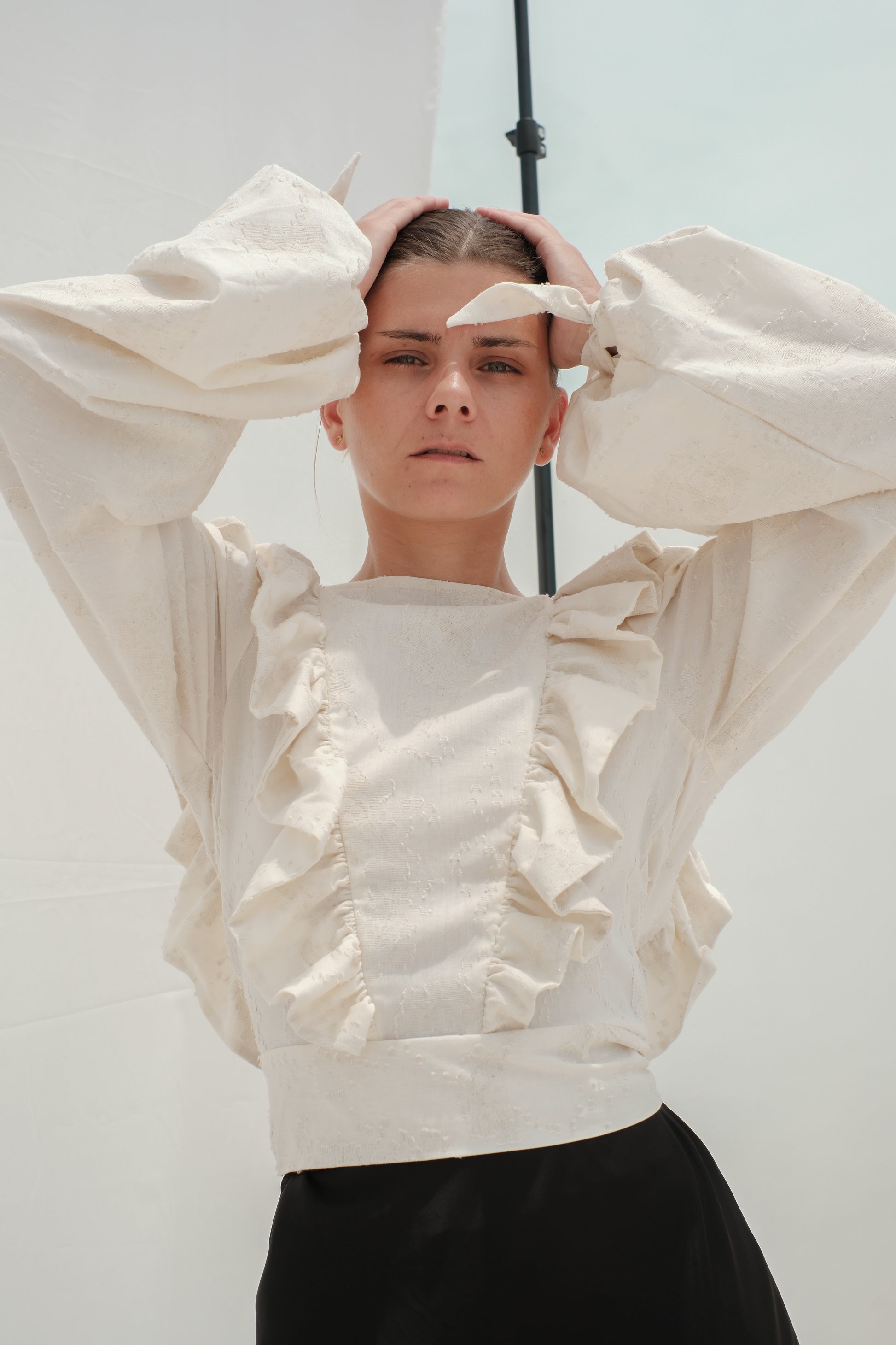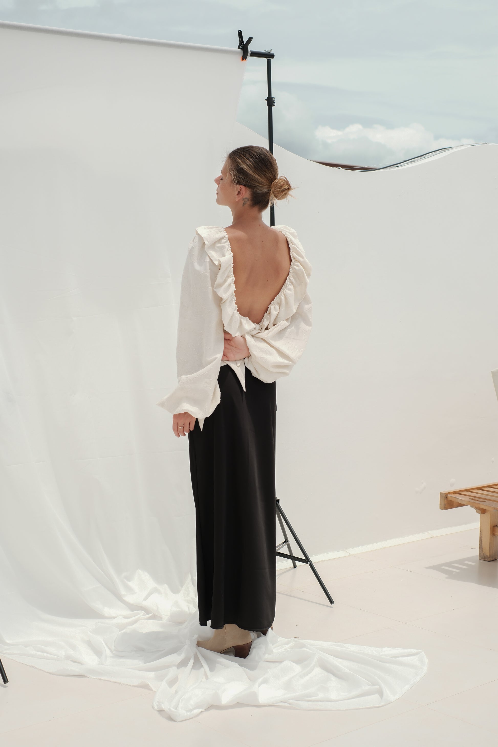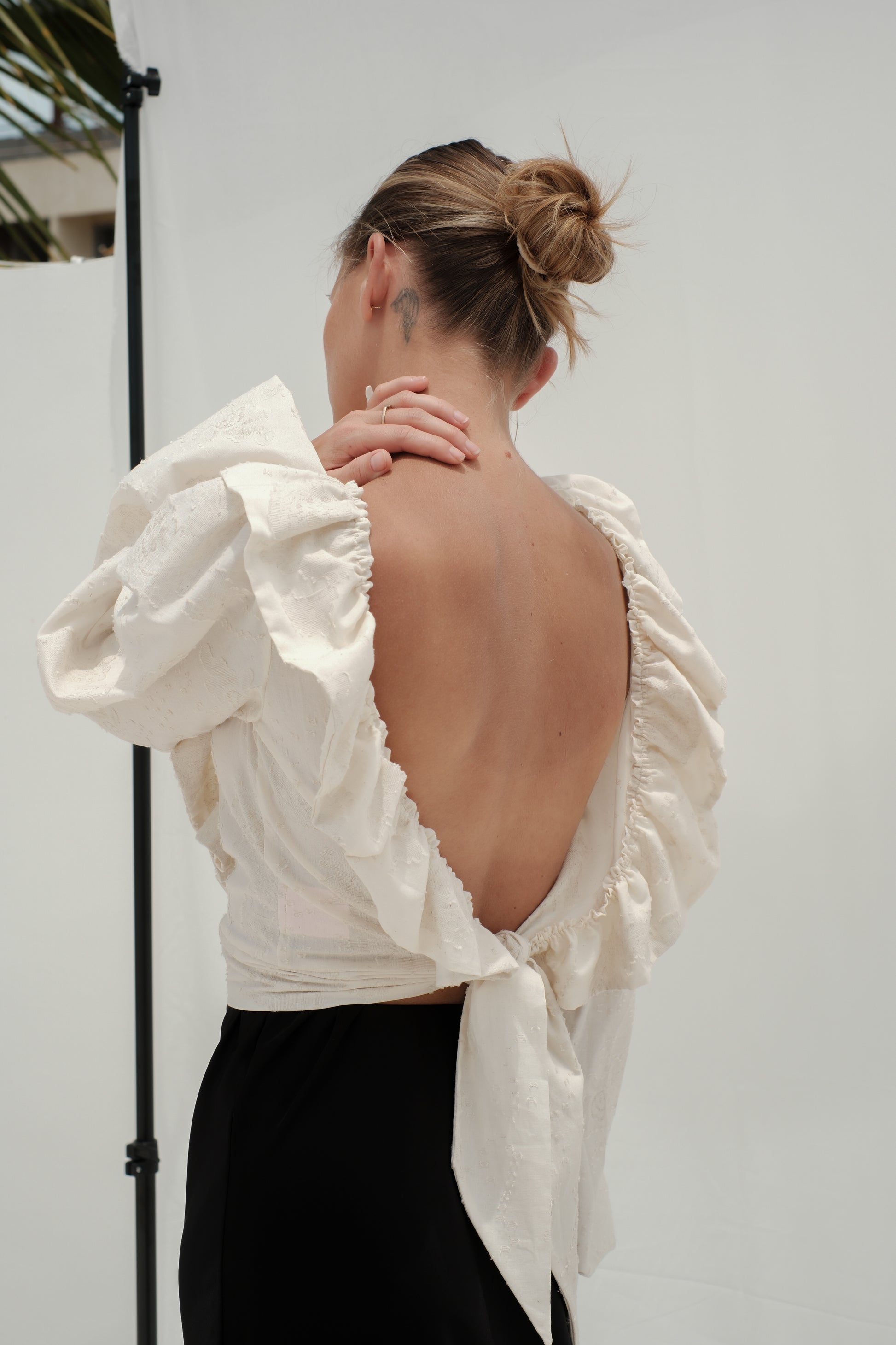Zadní část je výrazně otevřená, lemovaná volánem a doplněná zavazováním, takže top působí sofistikovaně a zároveň odlehčeně. Balonové rukávy dodávají celému modelu objem a lehkost.